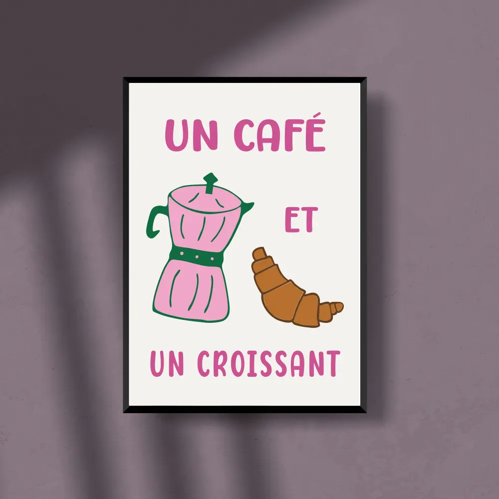 [Eng] Start your day the French way with this cozy coffee poster featuring a pink moka pot and a golden croissant. Perfect for your kitchen wall or breakfast nook, this art print captures the charm of Parisian mornings and the simple joy of coffee and pastry.