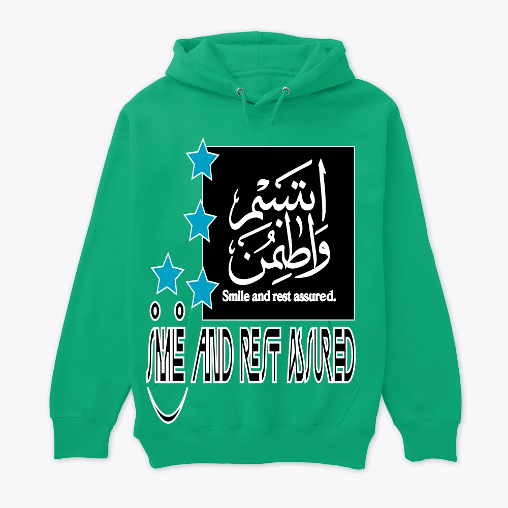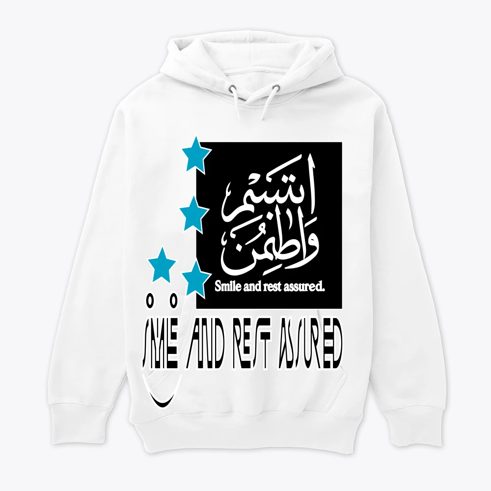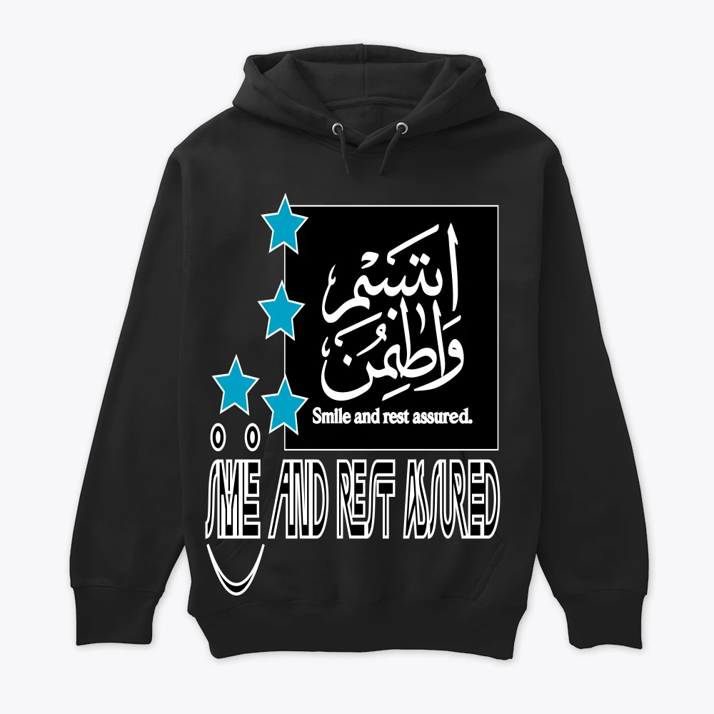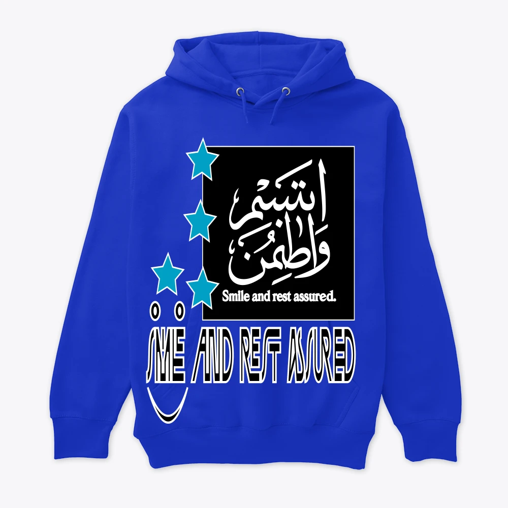 A stylish design combining modern Arabic calligraphy with the motivational phrase “Smile and rest assured.” Decorated with blue stars and a playful smiley touch, this artwork symbolizes positivity, peace of mind, and optimism. Perfect for shirts, stickers, and mugs for Arabic art and positive vibes lovers.