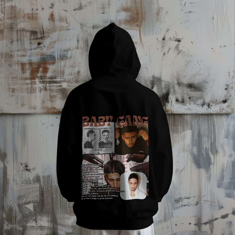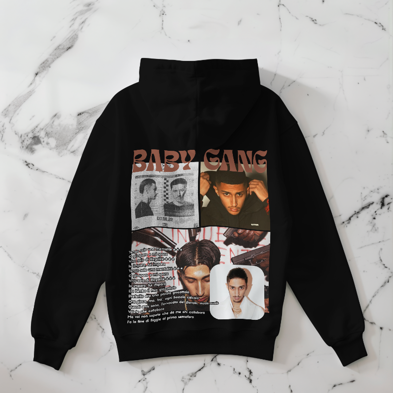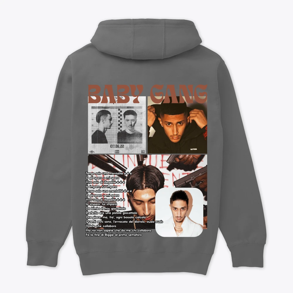 Custom BABY GANG hoodie featuring iconic mentality-inspired lyrics on the back and a selection of his standout photos. We also offer personalized hoodie designs for any rapper you choose.