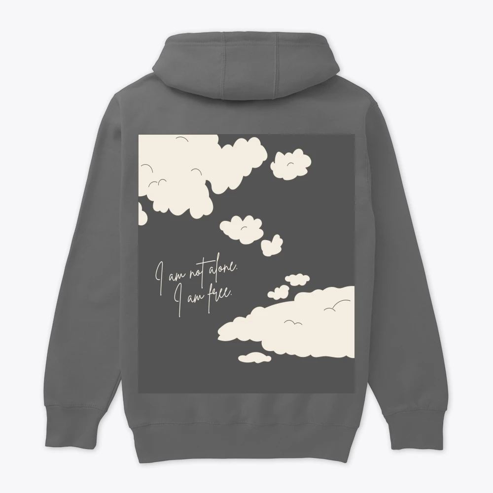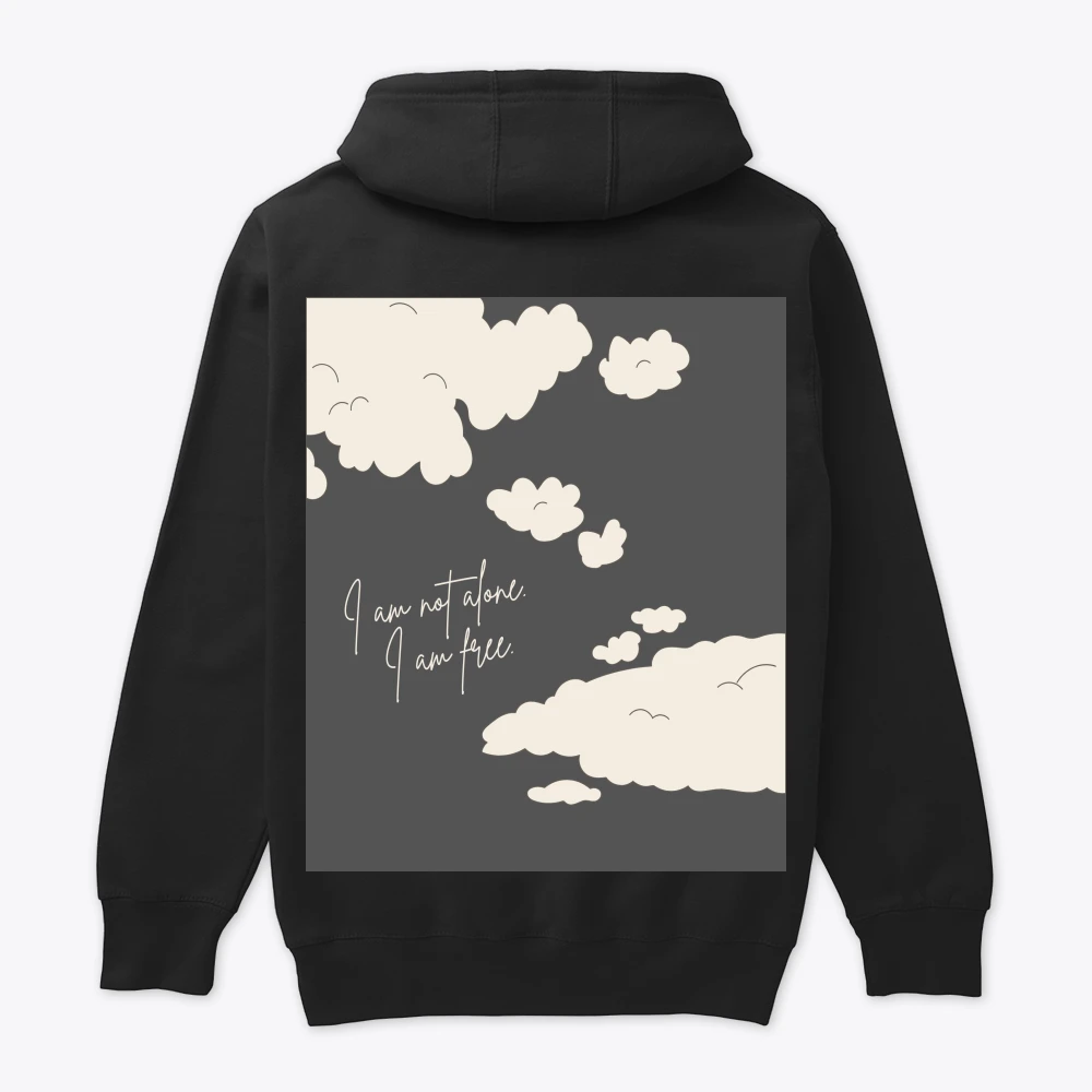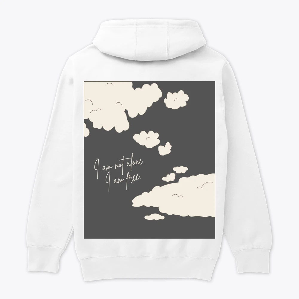 Find your calm in the clouds with the Cloud Serenity // I Am Free Hoodie. This peaceful white hoodie features a minimalist, tranquil back graphic with soft, stylized clouds floating against a deep, serene background. The central message, penned in an elegant script, reads: "I am not alone. I am free." It's a powerful statement of self-assurance and quiet liberation. Crafted from comfortable, premium fleece, this hoodie is designed to be your cozy reminder to embrace your independence and the peace found in solitude.