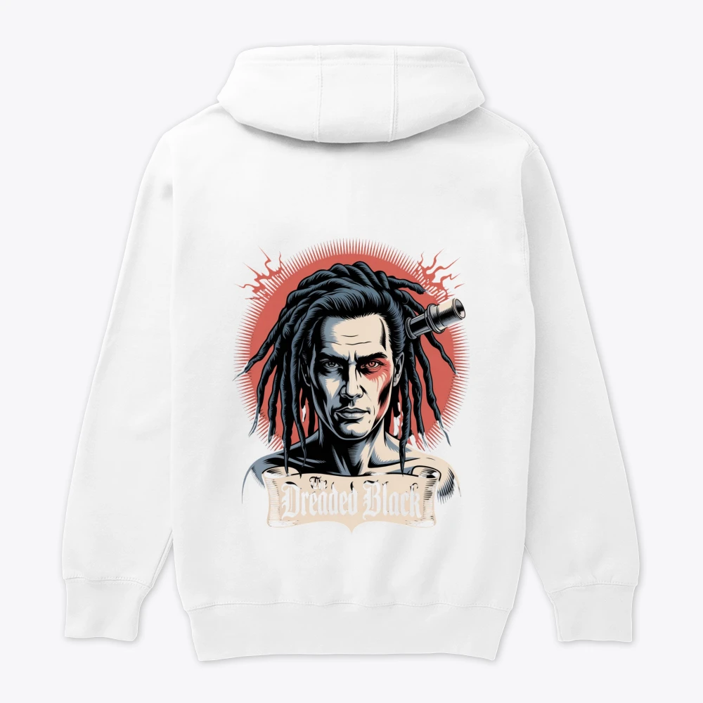 the image features a fierce warrior with dreadlocks and a telescope through his head set against a red sun backdrop conveying a pirate or nautical theme