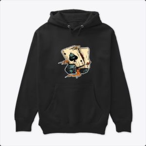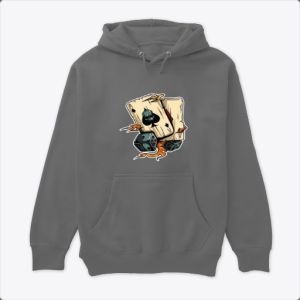 This Hoodie design, titled "Flaming Skull Aces & Dice," features a bold and dynamic graphic that combines elements of risk and rebellion. The artwork showcases two weathered aces—one with a skull embedded in the spade—paired with a set of dice, all engulfed in vibrant, swirling flames. The distressed look of the cards and dice adds a rugged, vintage vibe, while the flames inject energy and intensity into the design. Perfect for those who love edgy, alternative fashion, this Hoodie makes a powerful statement about daring and defying the odds.