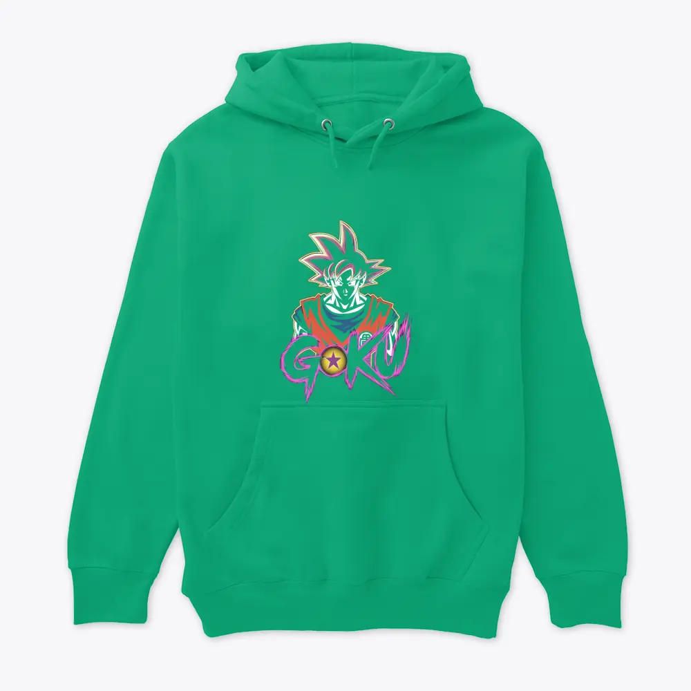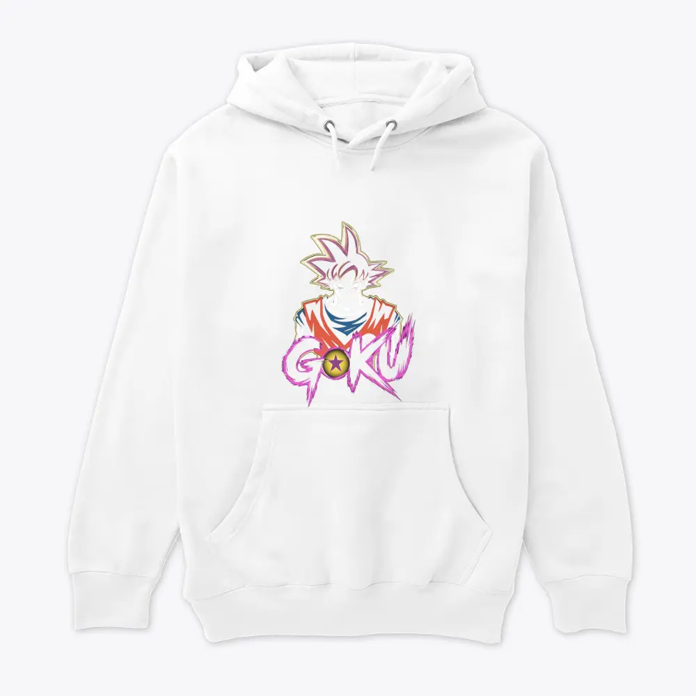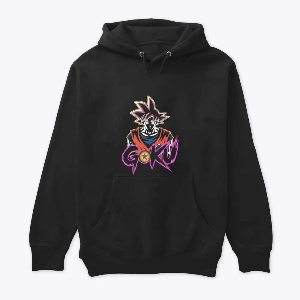 this image features a stylized portrait of an anime character with spiky hair and an orange gi set against a striking purple text background