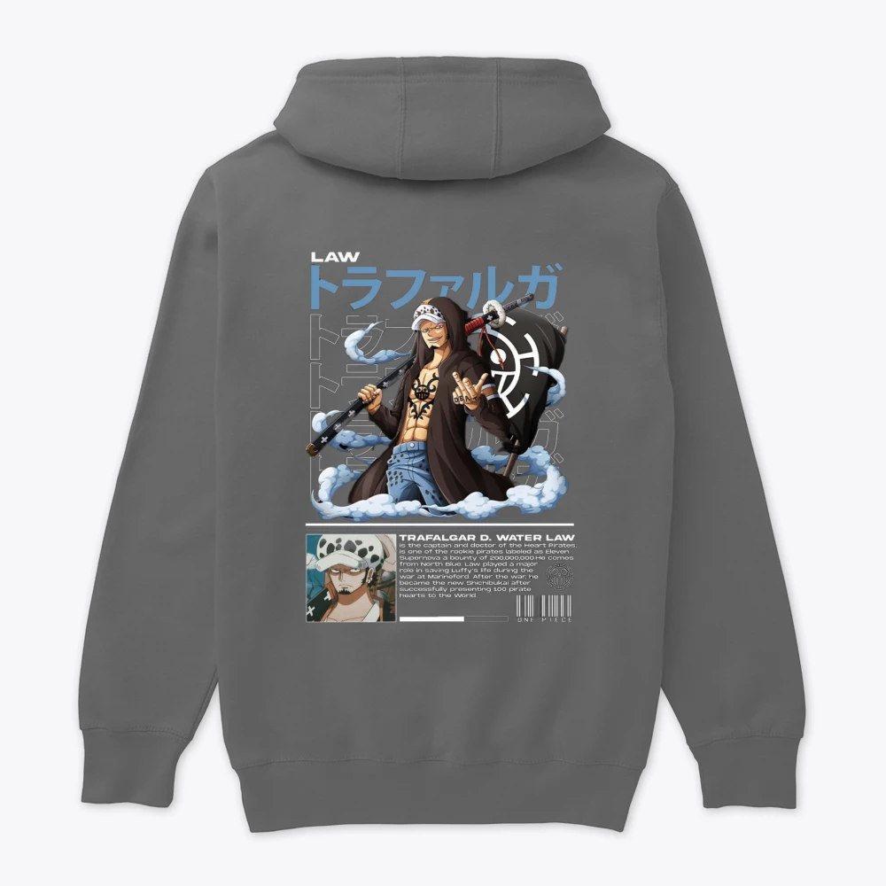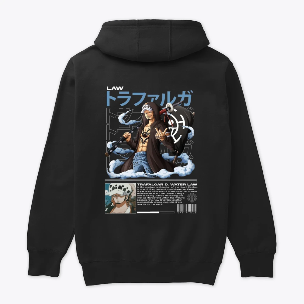 تصميم مستوحى من شخصية Trafalgar D. Water Law من أنمي One Piece، يجمع بين الأناقة والغموض بأسلوب فني مميز لمحبي الأنمي.