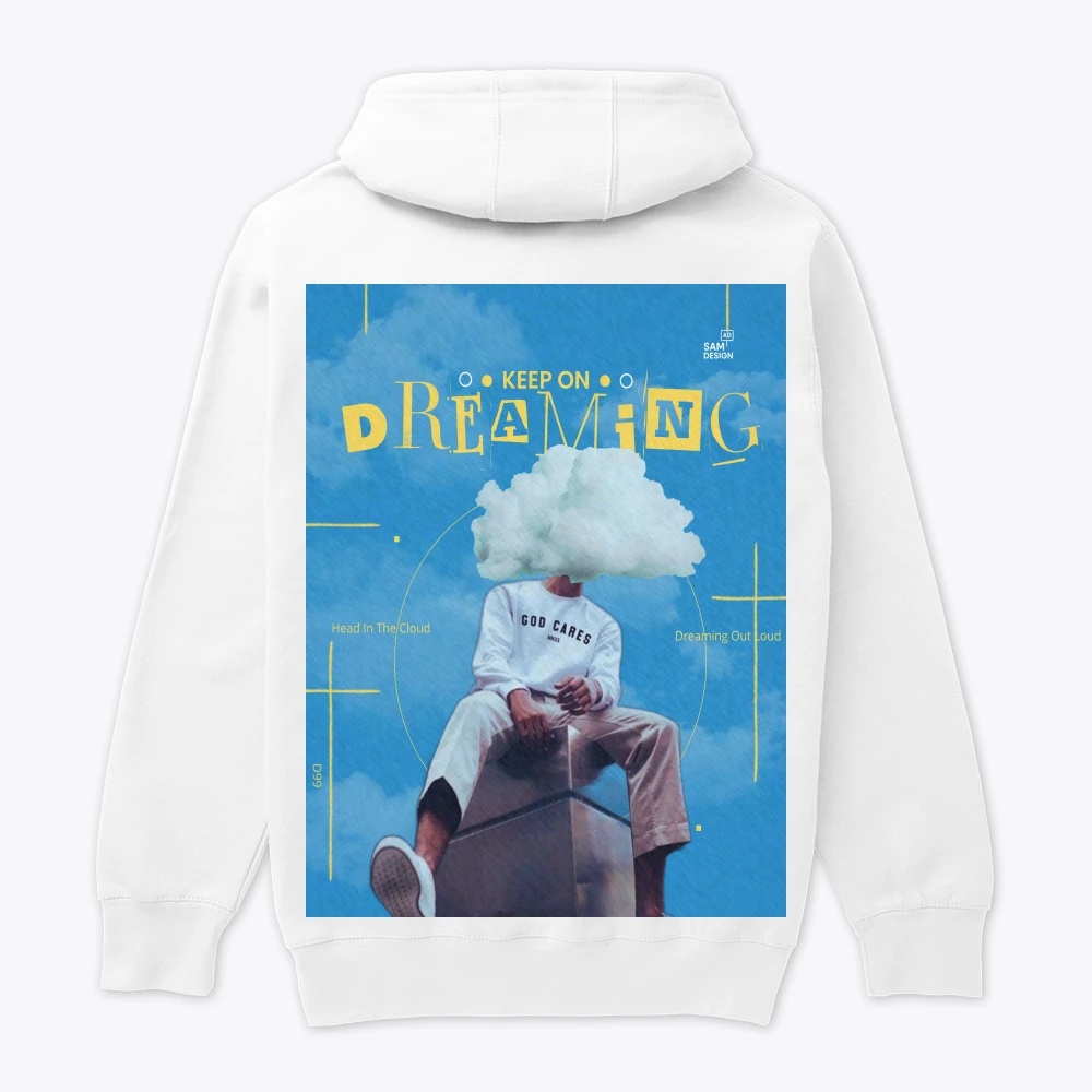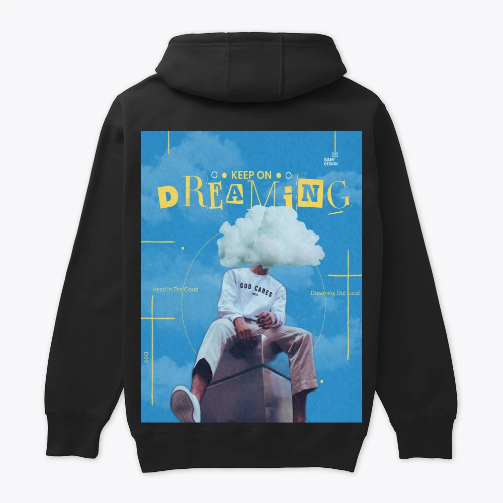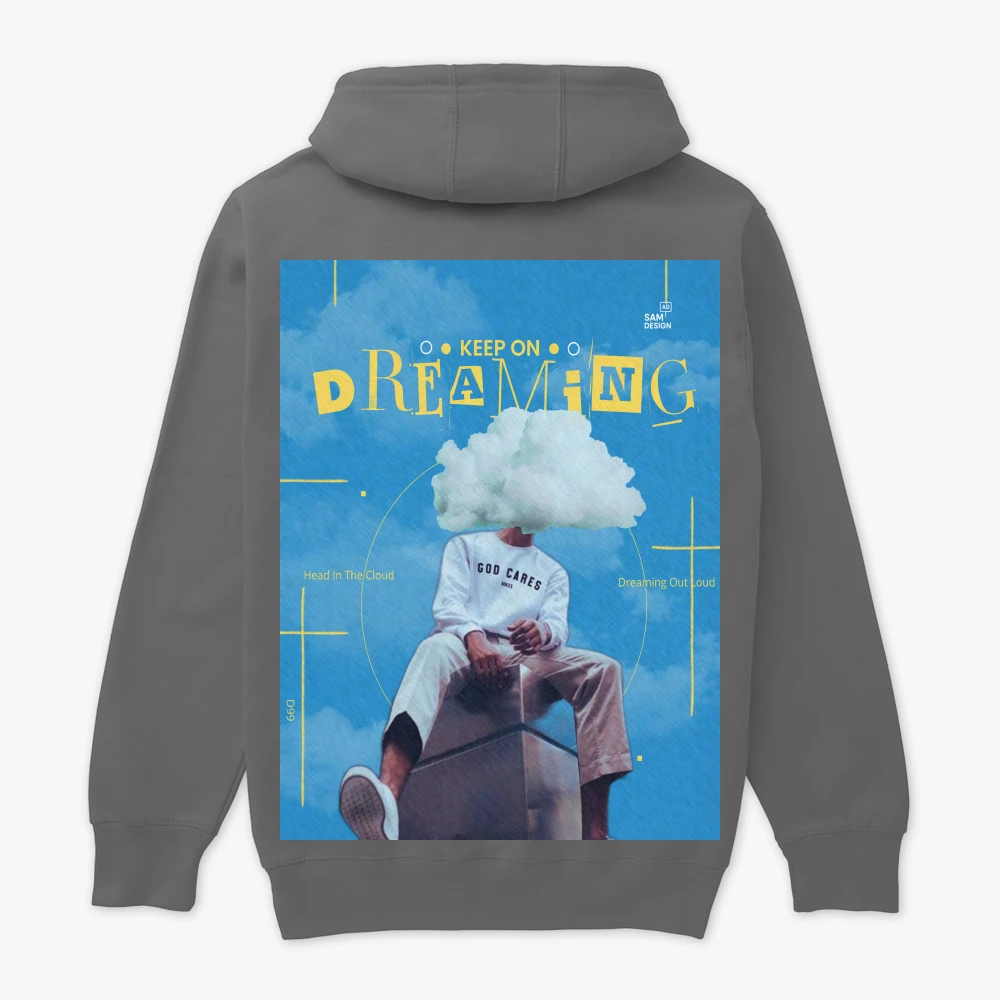 Float through your day with the KEEP ON DREAMING // Head In The Cloud Hoodie. This vibrant blue hoodie features an evocative back graphic that celebrates imagination and ambition. A figure with a whimsical cloud for a head sits confidently, embodying the spirit of deep thought and endless possibilities. The bold, playful "KEEP ON DREAMING" typography, along with phrases like "Head In The Cloud" and "Dreaming Out Loud," creates a powerful, optimistic message. Surrounded by a serene sky backdrop with subtle grid lines, this design blends surreal art with contemporary street style. Crafted for ultimate comfort, it's perfect for dreamers, creators, and anyone who isn't afraid to let their mind wander.