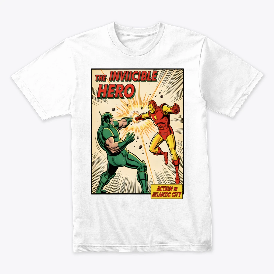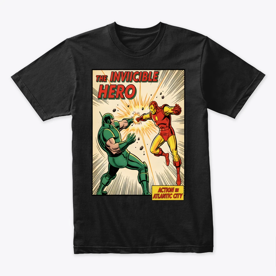 invincible hero, retro comic, vintage battle, classic superhero, golden age art, action design, comic nostalgia, heroic power, vintage artwork, superhero fan