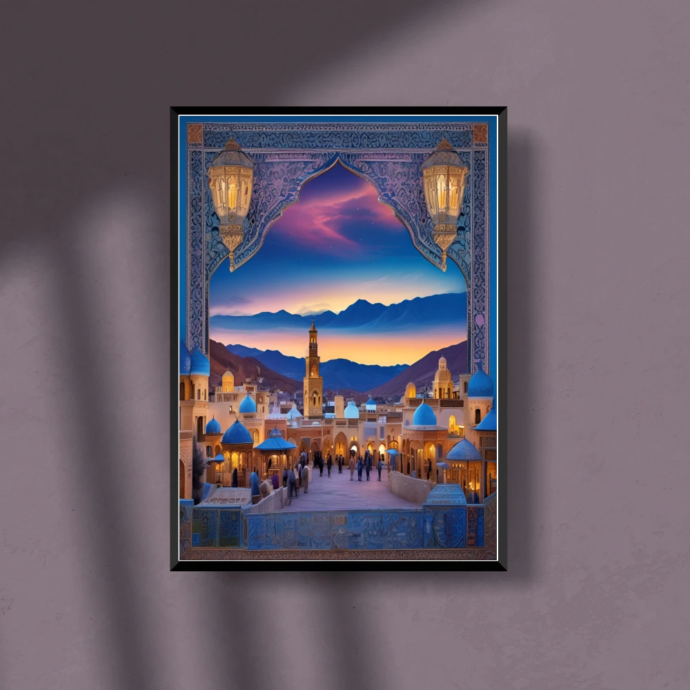 مشهدٌ ساحر لمدينة شرقية عند الغروب، تتلألأ قبابها الزرقاء ومآذنها المضيئة بين الجبال البعيدة، بينما يغمر الضوء الذهبي الساحات المزخرفة بلمسة من السكون والجمال الأبدي.