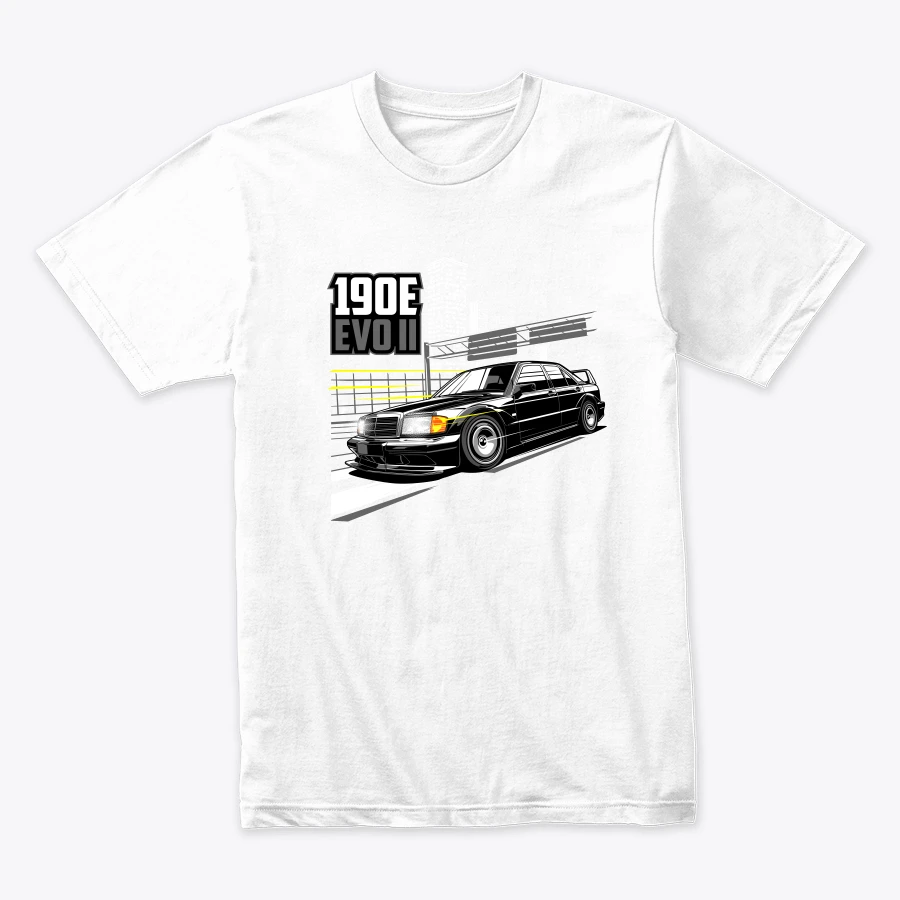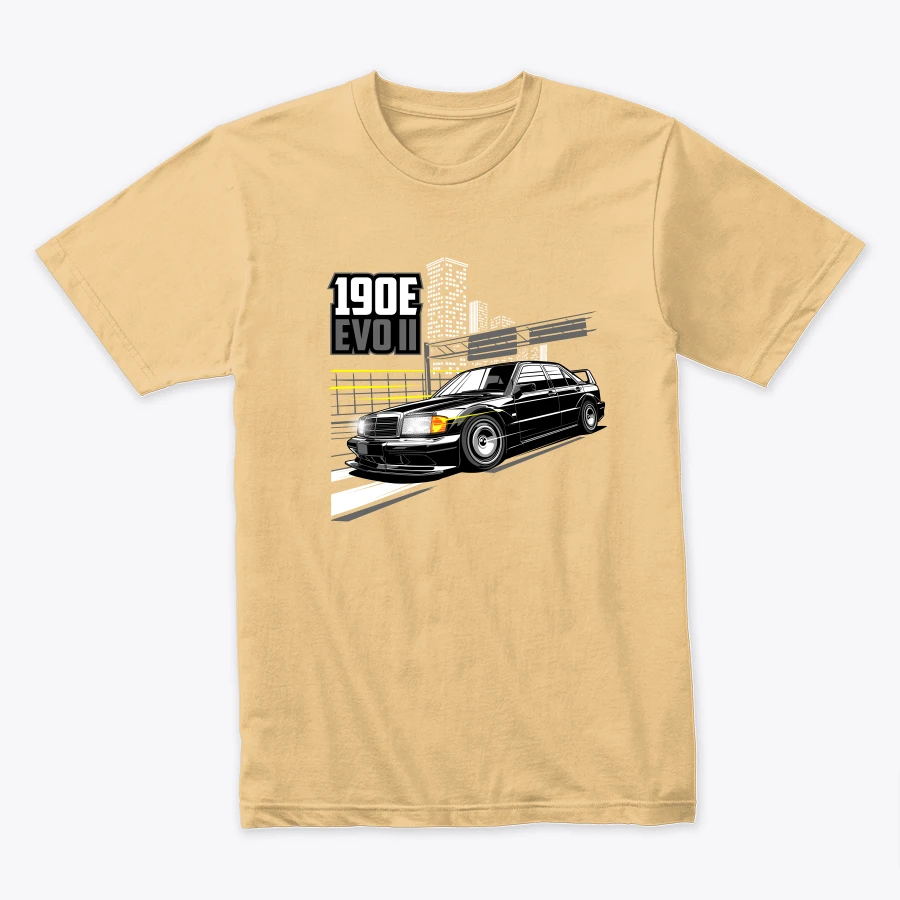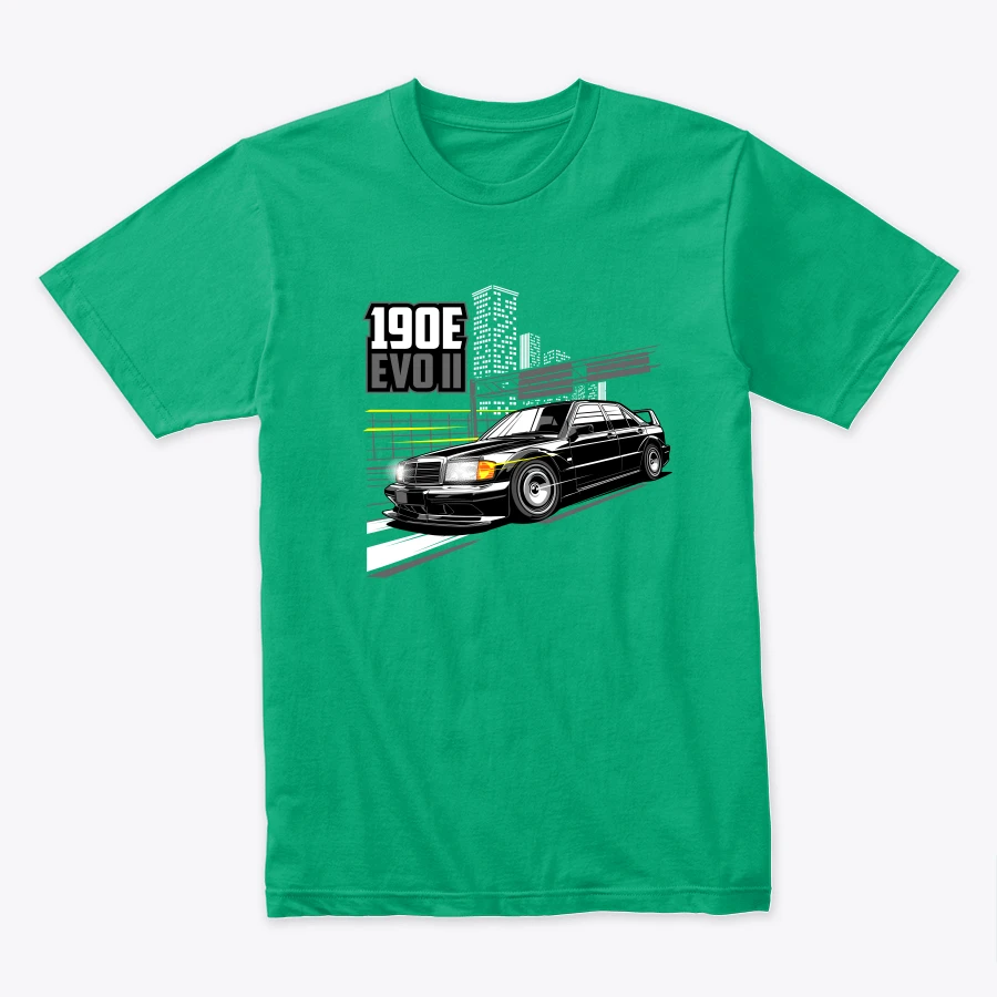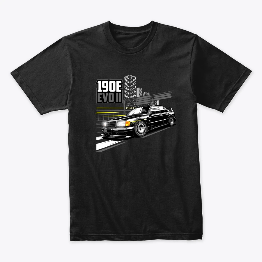 a stylish illustration of the mercedes 190e evolution ii set against an urban background highlighting the cars sleek design and performance attributes