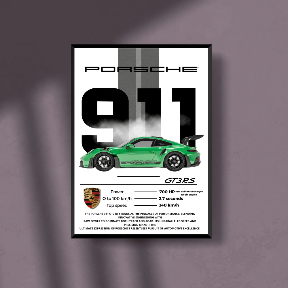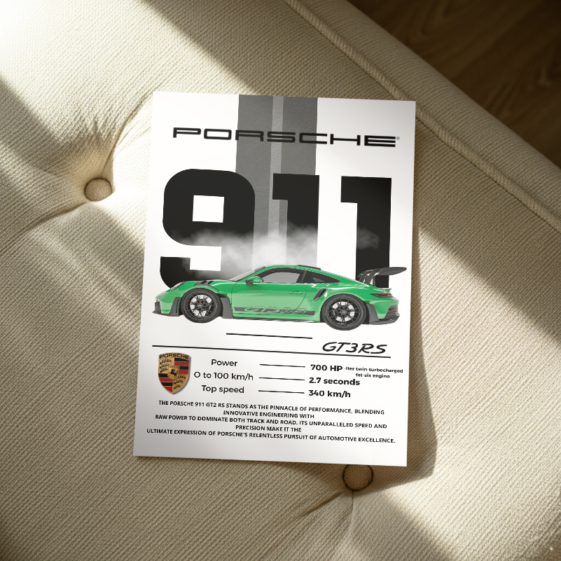 Positioned in front of the "911" graphic is a side view illustration of a green Porsche 911 GT3 RS car with its rear wing raised.