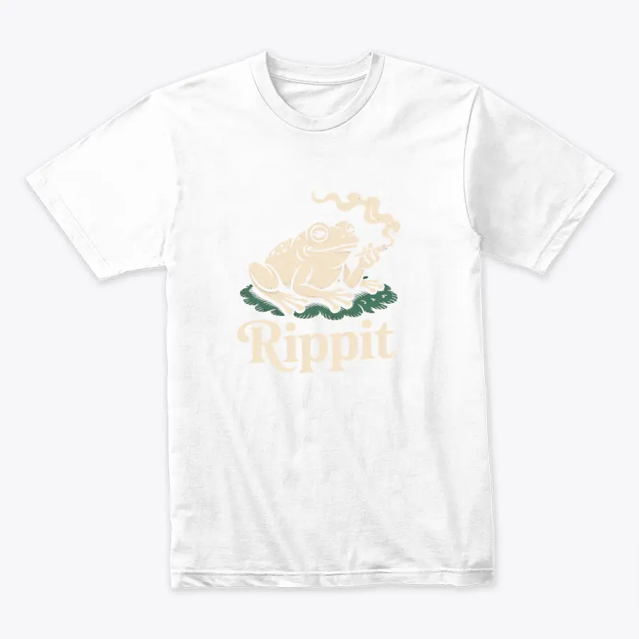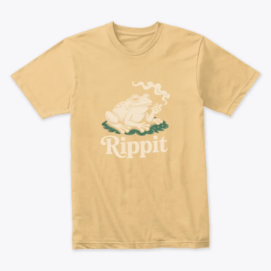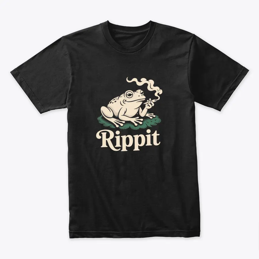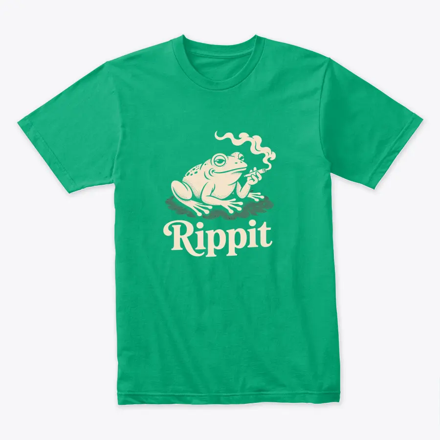 a whimsical illustration of a frog smoking with the word rippit beneath the frog sits on a leaf exuding a humorous and relaxed vibe