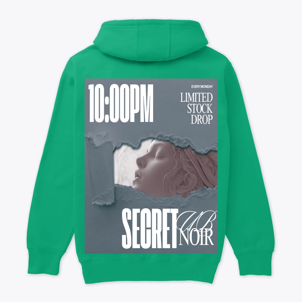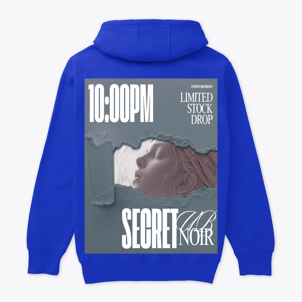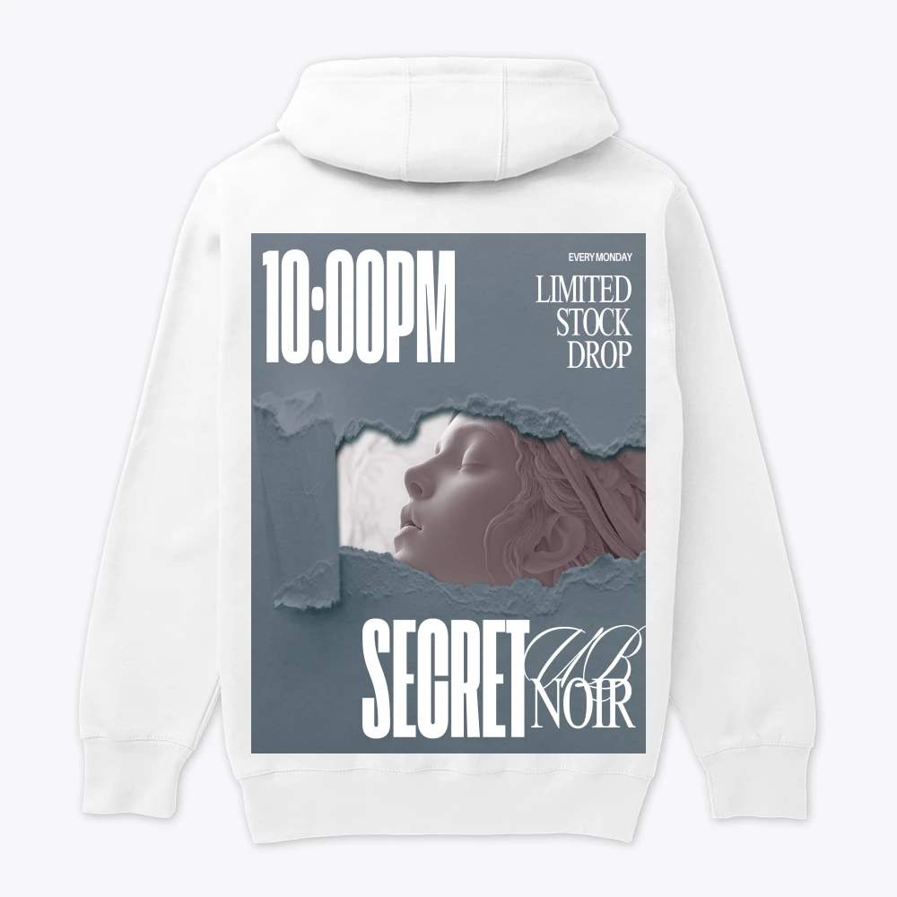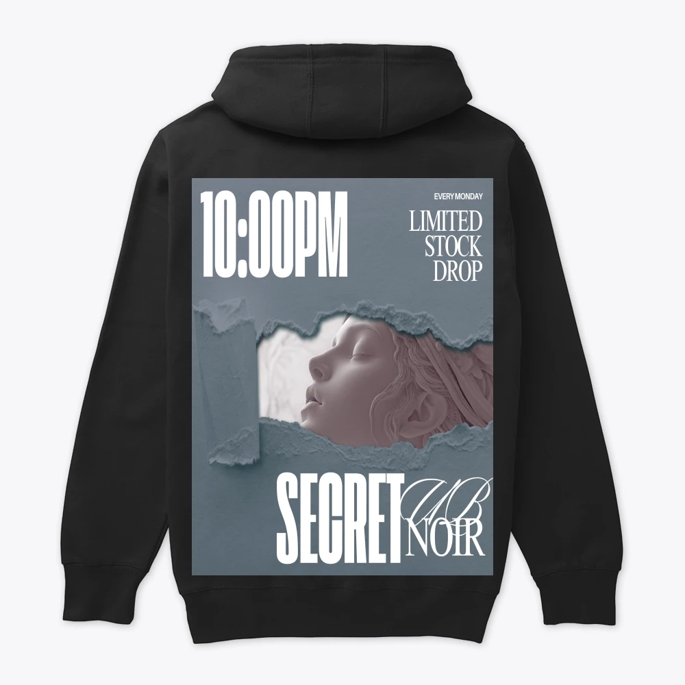 Step into the shadows of exclusive style with the SECRET NOIR // 10 PM Limited Drop Hoodie. This captivating black hoodie features a surreal, magazine-cover-style graphic that blends mystery and luxury. The design showcases an ethereal, sculpted face partially concealed behind torn paper, suggesting a hidden world of beauty and dreams. The bold, contrasting typography advertises an event: "10:00 PM EVERY MONDAY" with a "LIMITED STOCK DROP" and the enigmatic branding "SECRET NOIR." Crafted from premium fleece, this hoodie is for those who live for exclusivity and appreciate fashion that feels like a whispered secret.