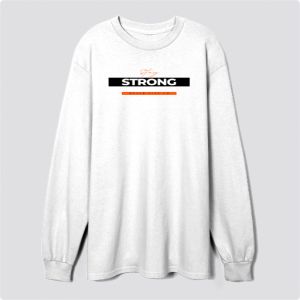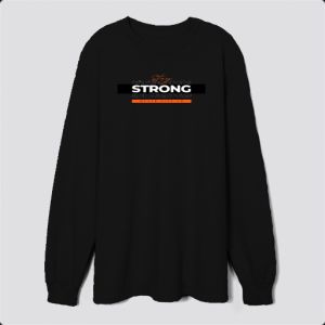 The design features bold, impactful typography. The word "Stay" is in a stylish, cursive orange font, while "STRONG" is displayed prominently in large black block letters on a white background. Below the main text, there's a motivational phrase, "Never Give Up," in black letters on an orange strip, reinforcing the message of resilience and perseverance. The overall design is simple yet powerful, making it suitable for an inspirational or motivational Sweatshirt.