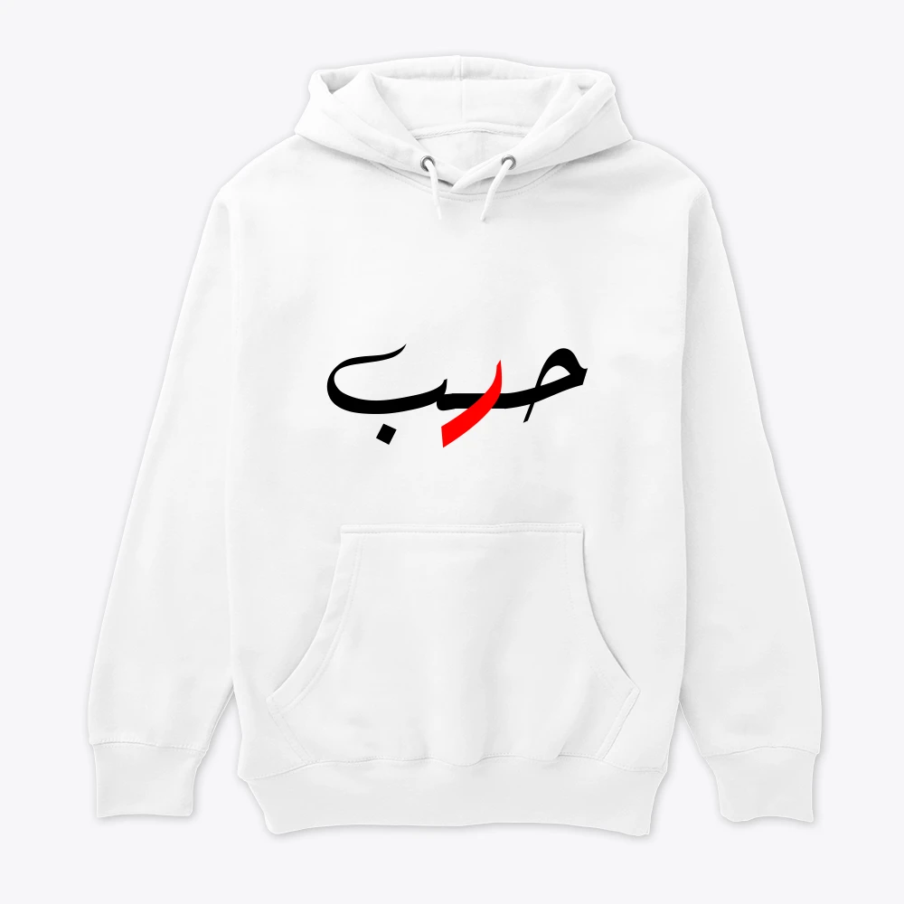 هذا القميص الأبيض يحمل تصميمًا عربيًا بسيطًا وعميقًا في آنٍ واحد — كلمة "حب" التي يمكن أن تتحول بسهولة إلى "حرب" بإضافة حرف واحد فقط.