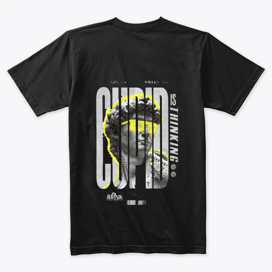 The phrase “Cupid Is Thinking” adds a playful twist to themes of love and introspection, while Japanese and Western text elements give the piece a global, mysterious vibe