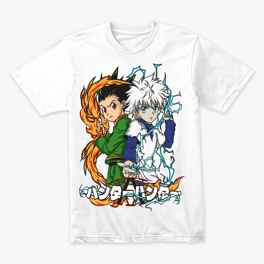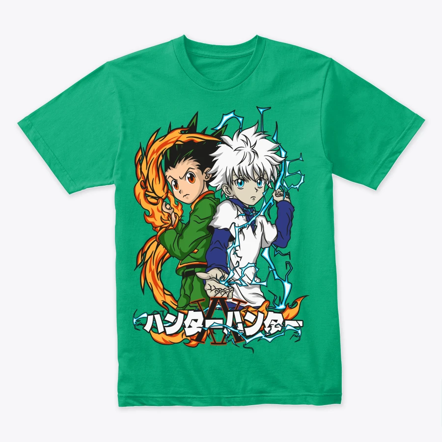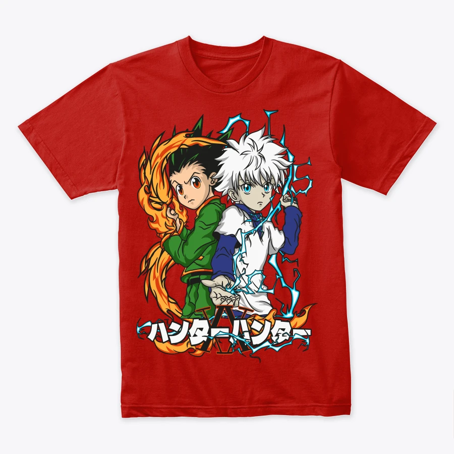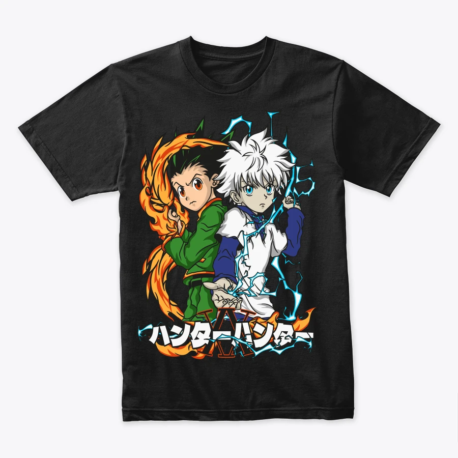 description two anime characters one with fiery background and the other with lightning stand backtoback in a dynamic pose symbolizing contrast and partnership
