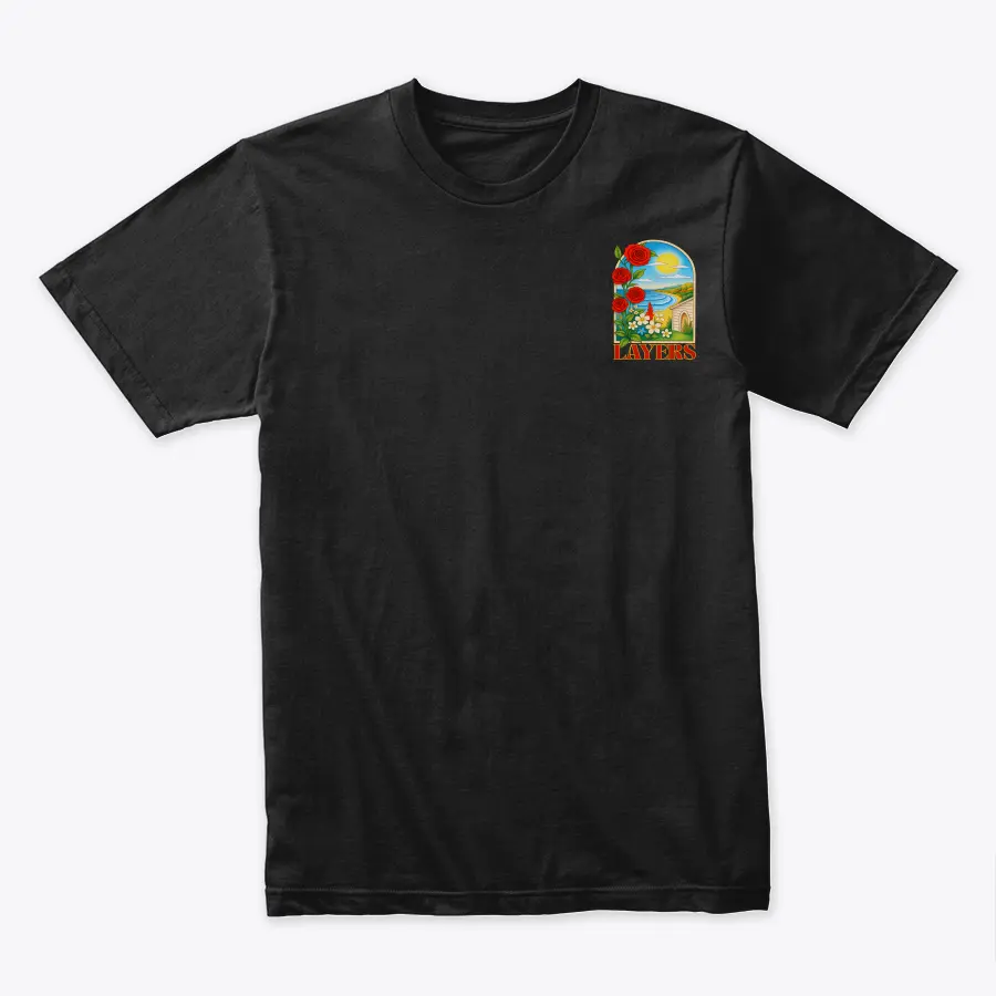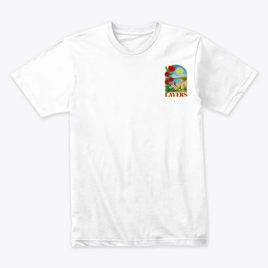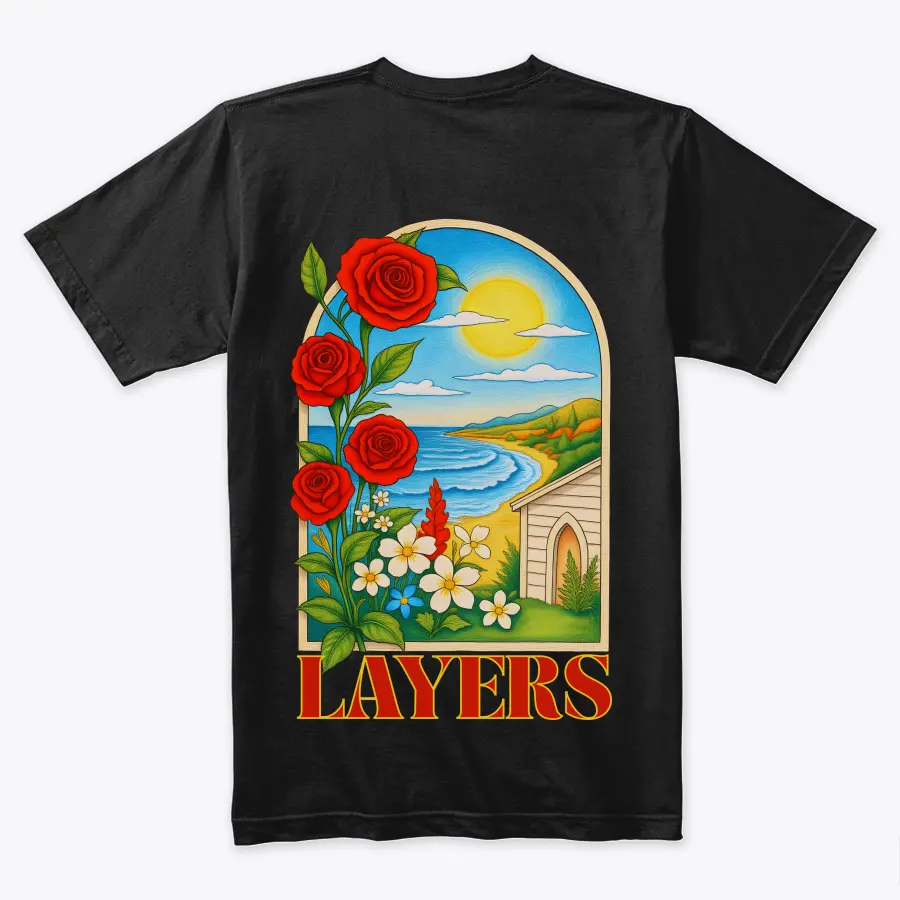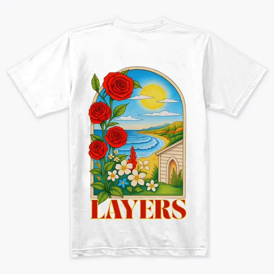 Bring the coast with you. Our Coastal Bloom design blends red roses, wildflowers, and a golden shoreline under a bright sun—rendered in a hand-drawn, stained‑glass–inspired frame with the signature LAYERS typography. This statement graphic t-shirt deliver rich color, clean lines, and a timeless vintage feel. Choose the breathable tee for warm days. Unisex, true-to-size, and easy to style—ideal for nature lovers, beach goers, and anyone into floral streetwear with a retro twist. Features Original Behind Layers artwork: roses, daisies, ocean waves, sunny coastline, arched window frame Vivid, durable print designed to resist fading and cracking Tee: soft, breathable cotton feel Unisex fit; wear true-to-size or size up for an oversized look