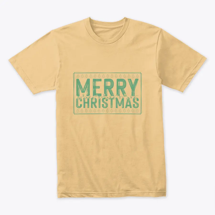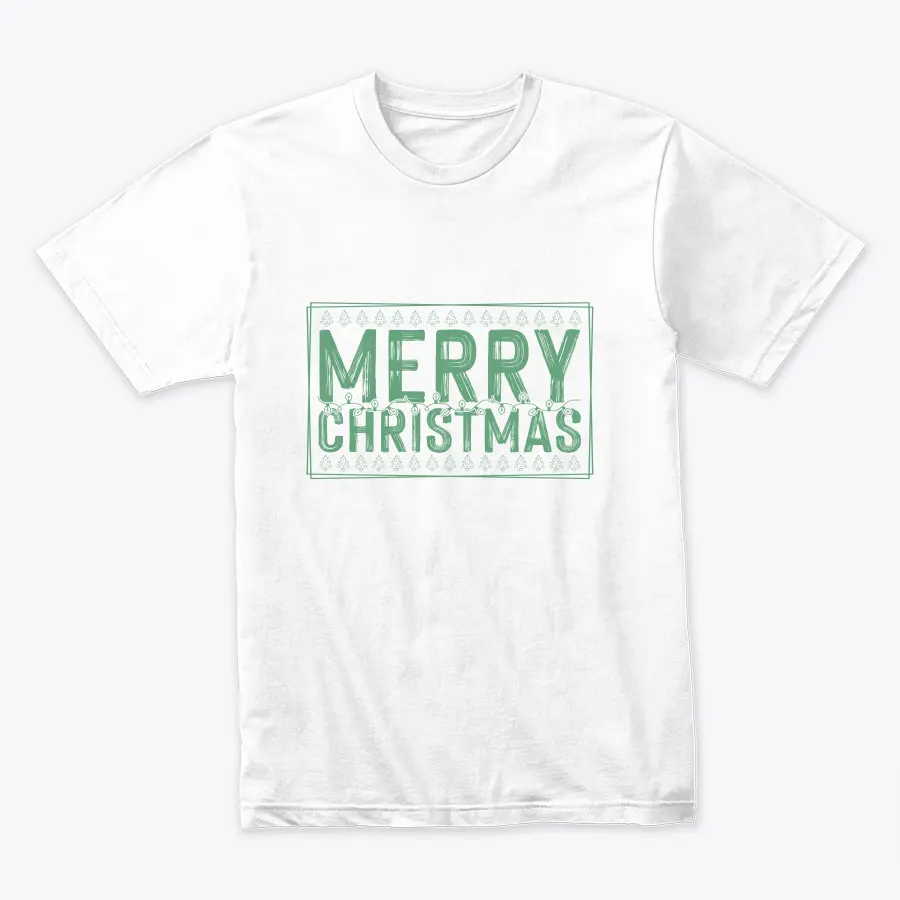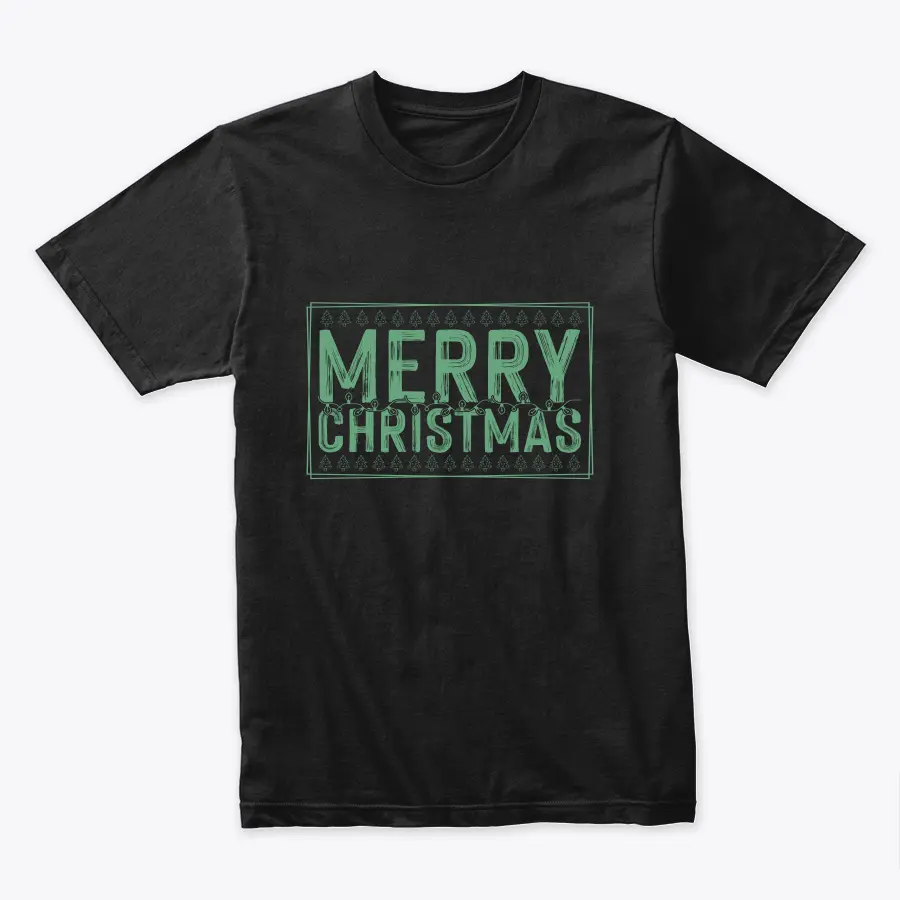 a green merry christmas greeting card featuring decorative borders of trees and lights capturing the festive spirit of the holiday season