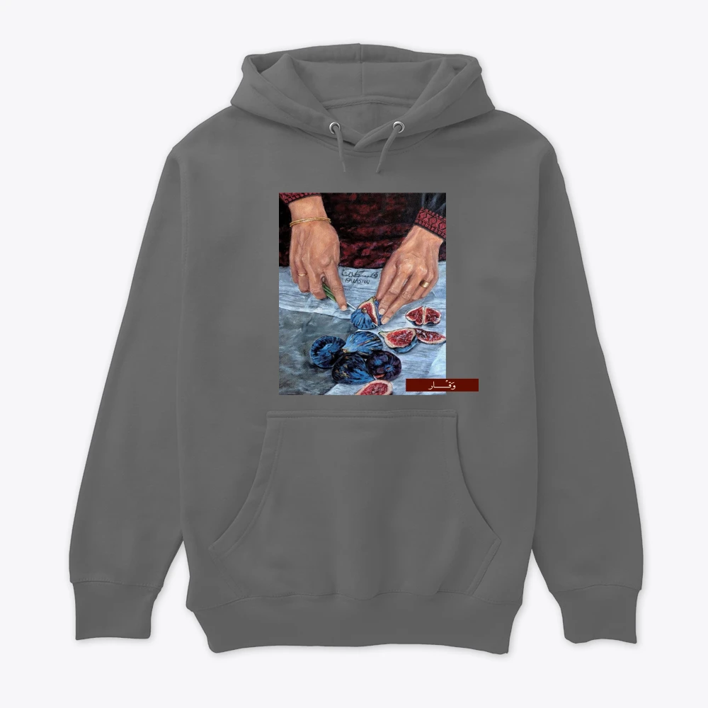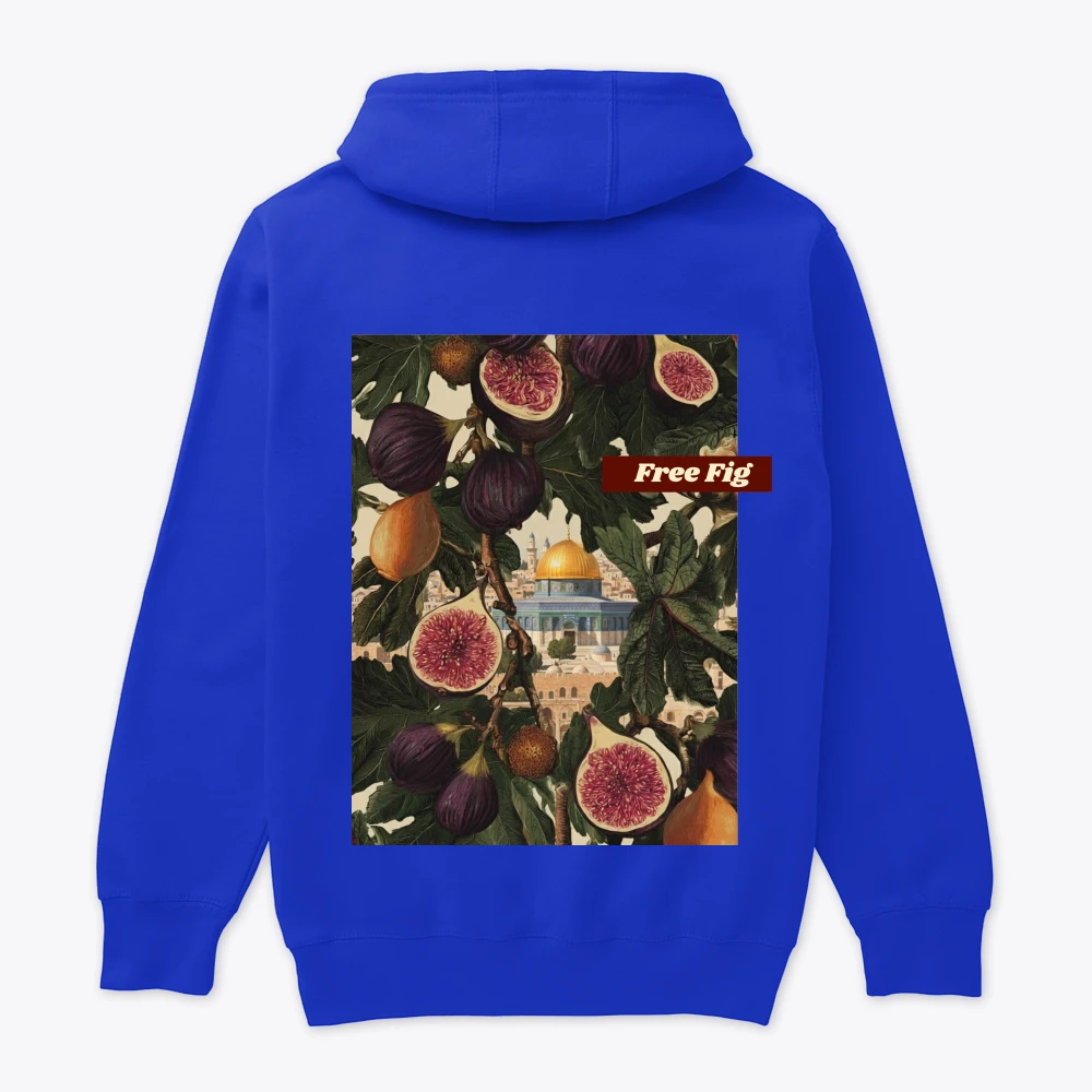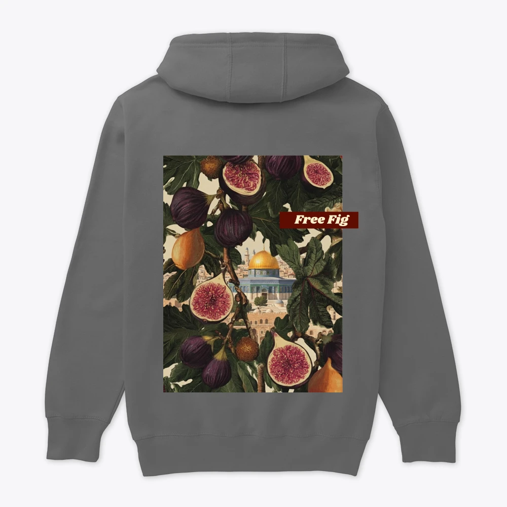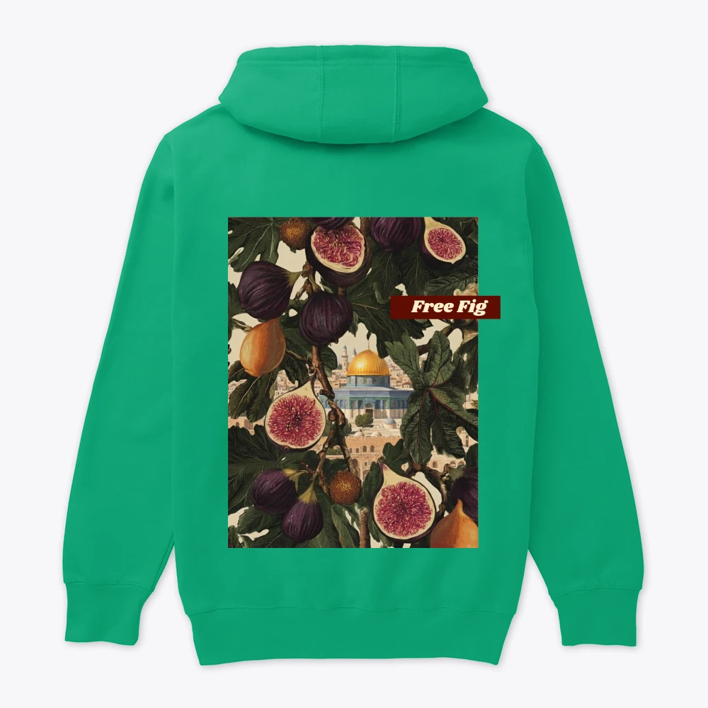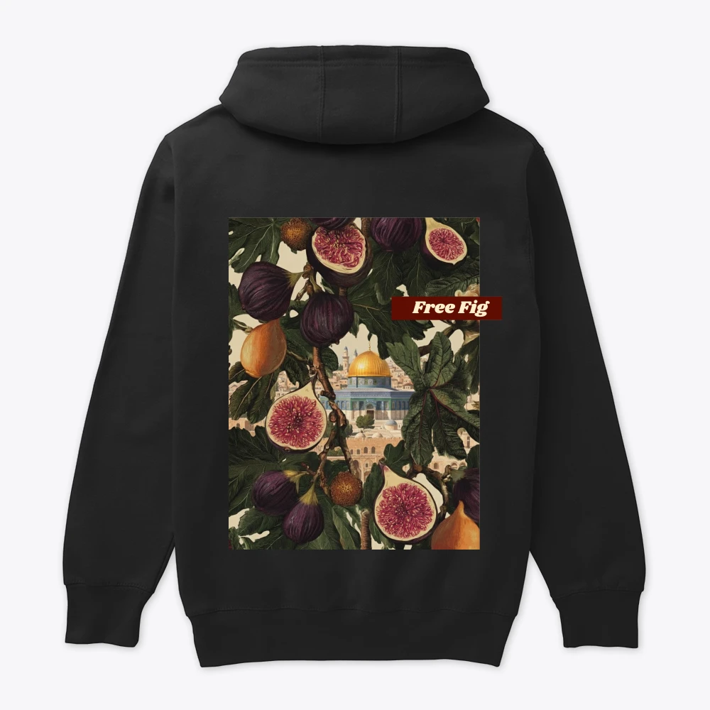 الخلفية (التين والقدس): تصميم مستوحى من الفن الفيكتوري الكلاسيكي، يدمج جمال رسومات التين العتيقة مع الرمزية العميقة لقبة الصخرة في القدس. يعلوه شعار "FREE FIG." الجريء بلونه الأبيض القوي، ليجسد الرابط الأبدي بين الأرض والهوية.