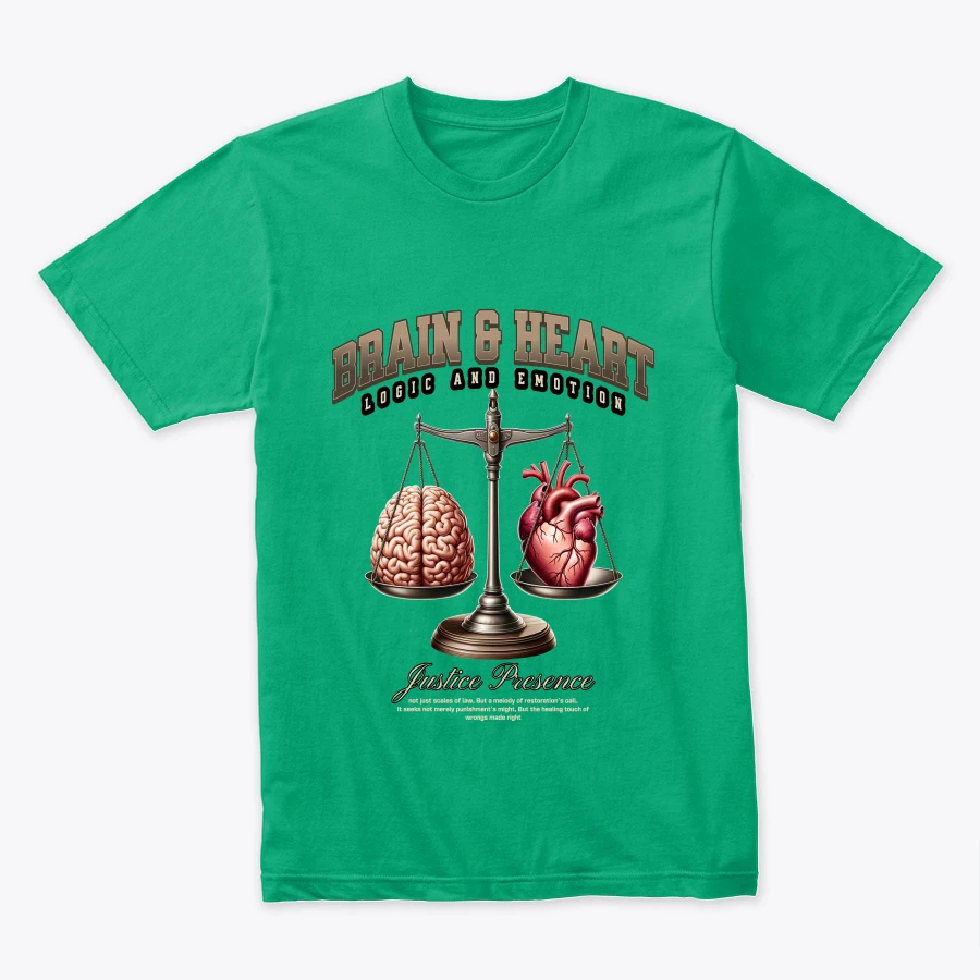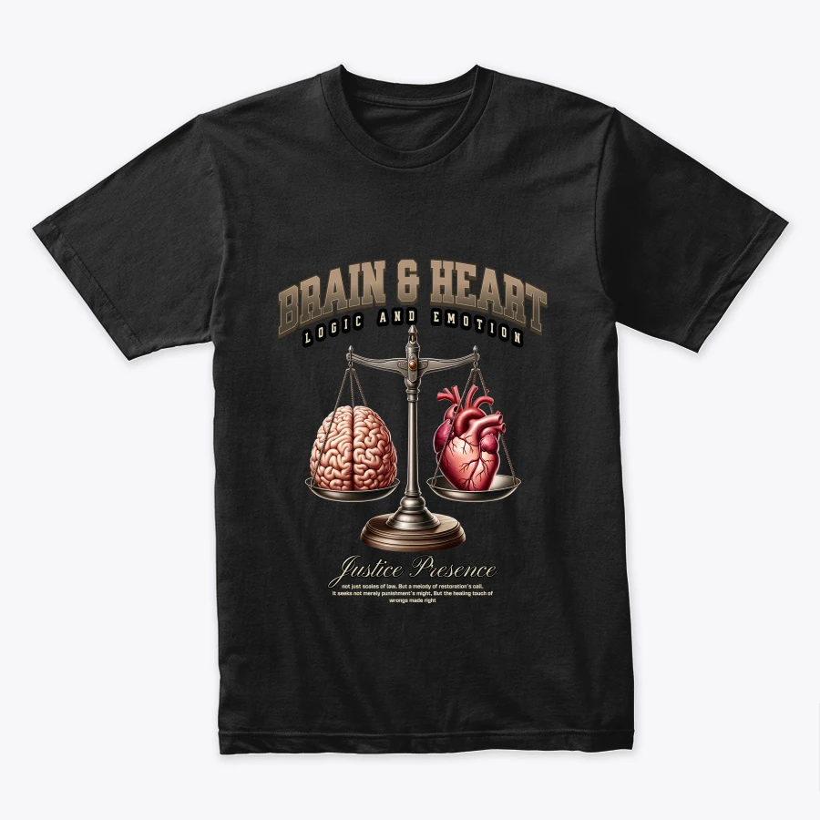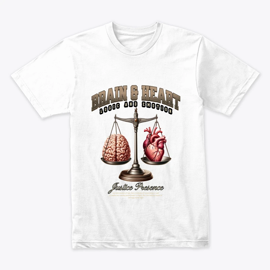 Le t-shirt a un design moderne et philosophique, exprimant l’idée de combiner la raison et l’émotion dans la prise de décision.