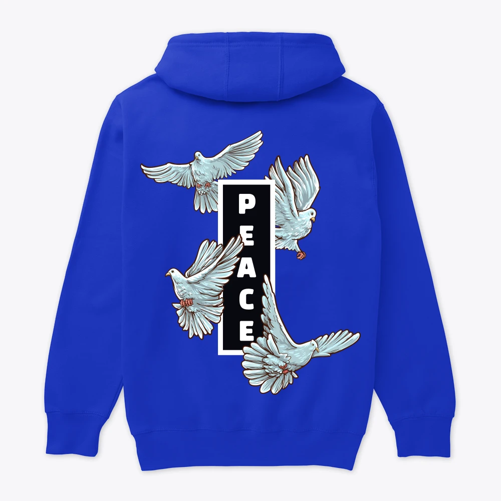Embrace serenity and positive messaging with the "PEACE Doves" Graphic Hoodie. This inspiring piece features a stunning, detailed illustration of four majestic white doves caught mid-flight, their soft, light blue-grey feathers creating a dynamic and calming composition.