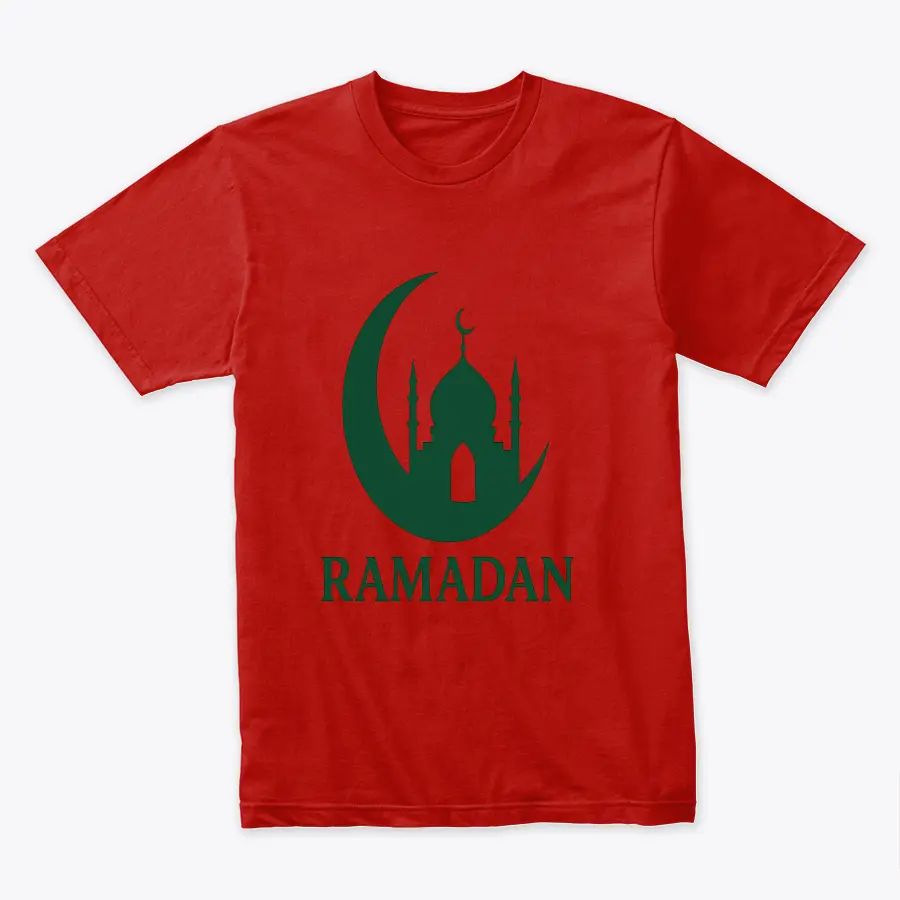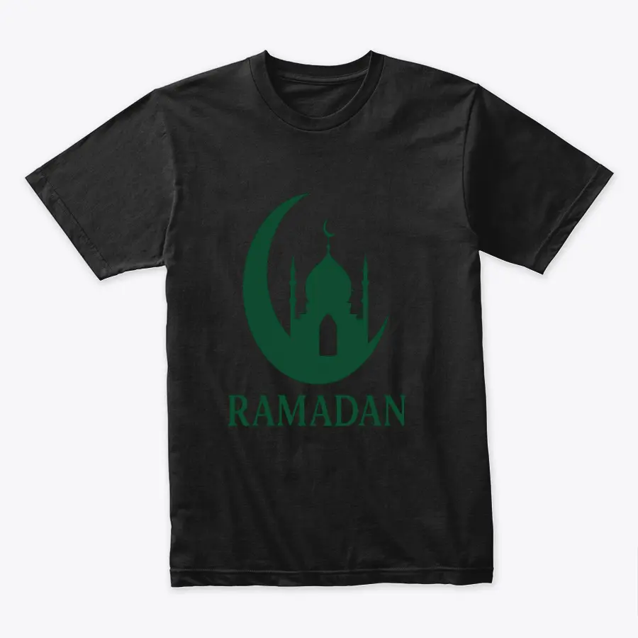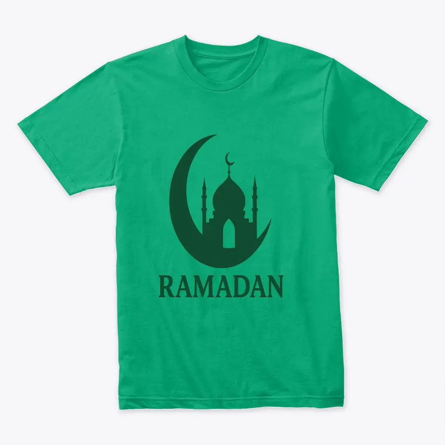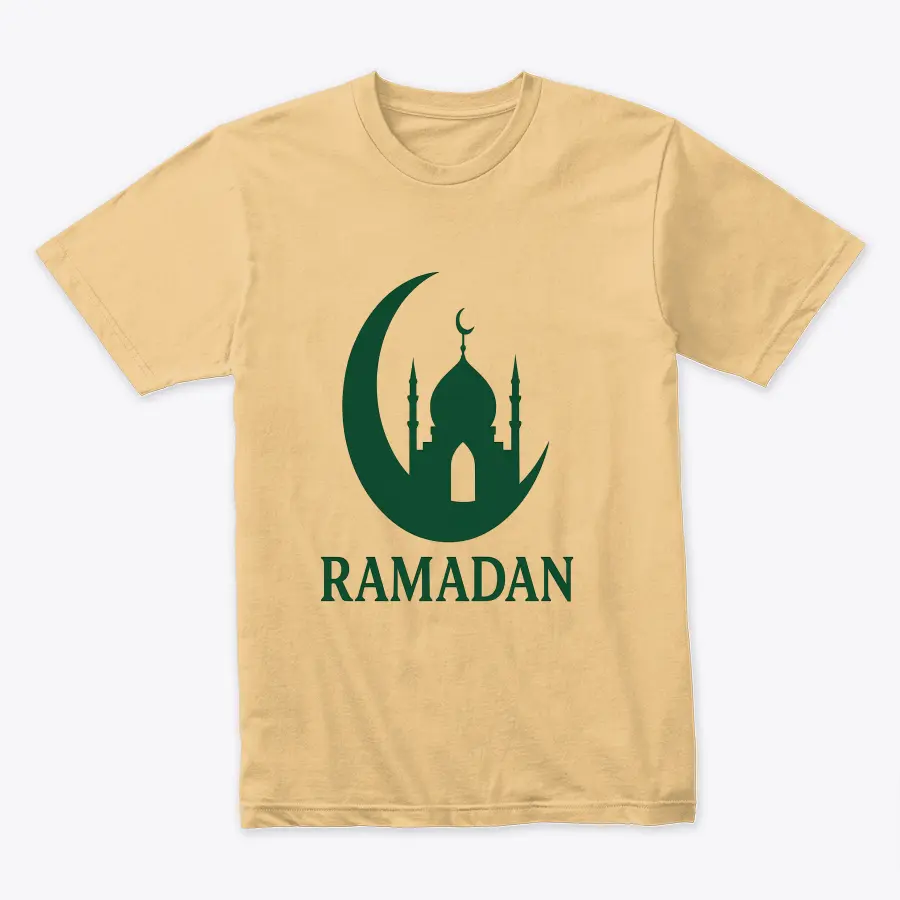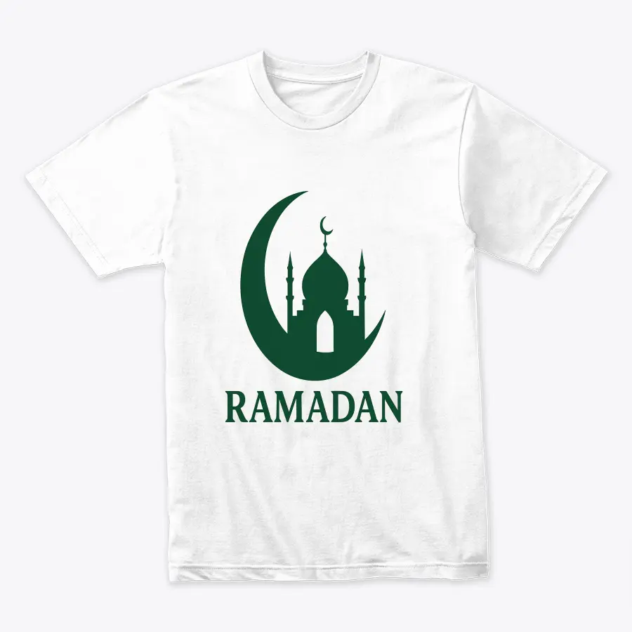 A minimalist Islamic Ramadan logo featuring a crescent moon embracing a mosque silhouette with domes and minarets. The design symbolizes spirituality, unity, and the holy month of Ramadan. The style is clean, elegan