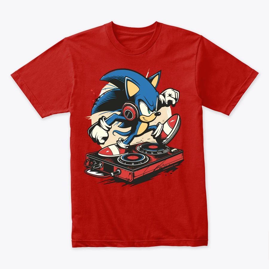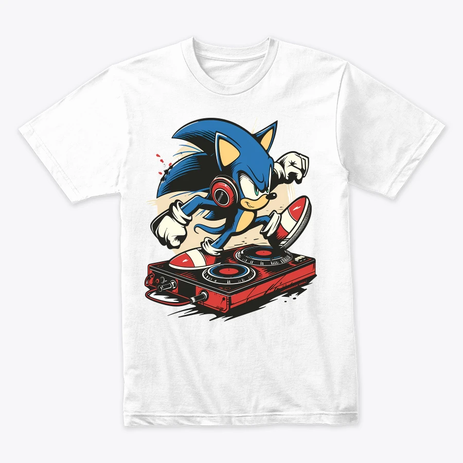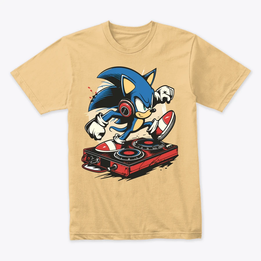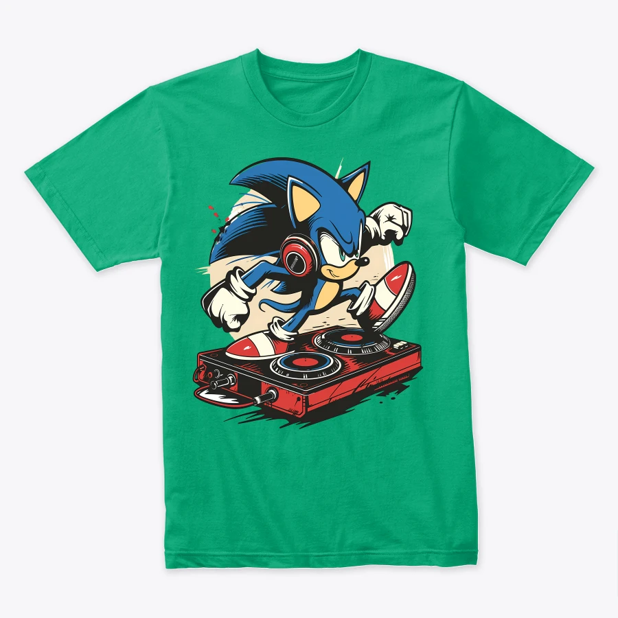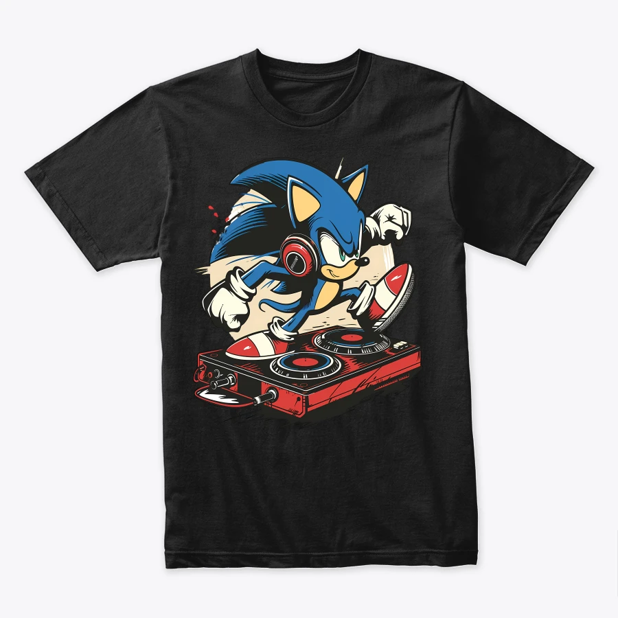 an energetic depiction of an animated blue hedgehog character mixing music on a turntable highlighting a fusion of gaming and musical themes