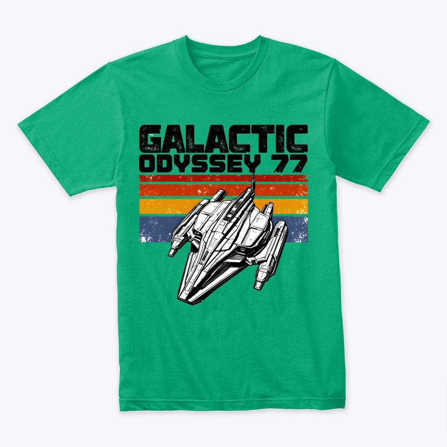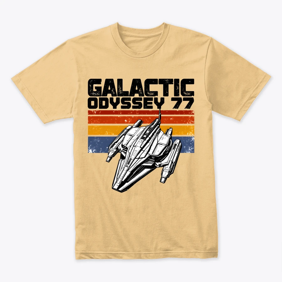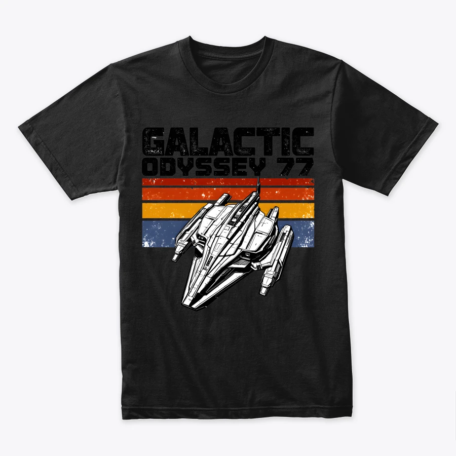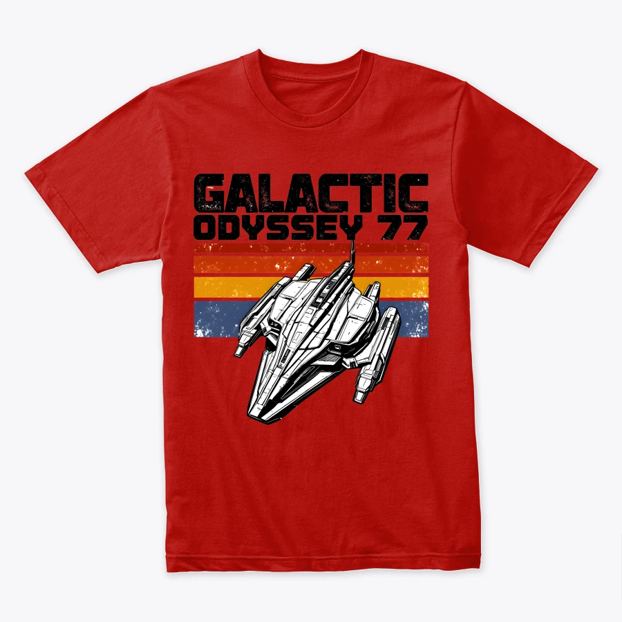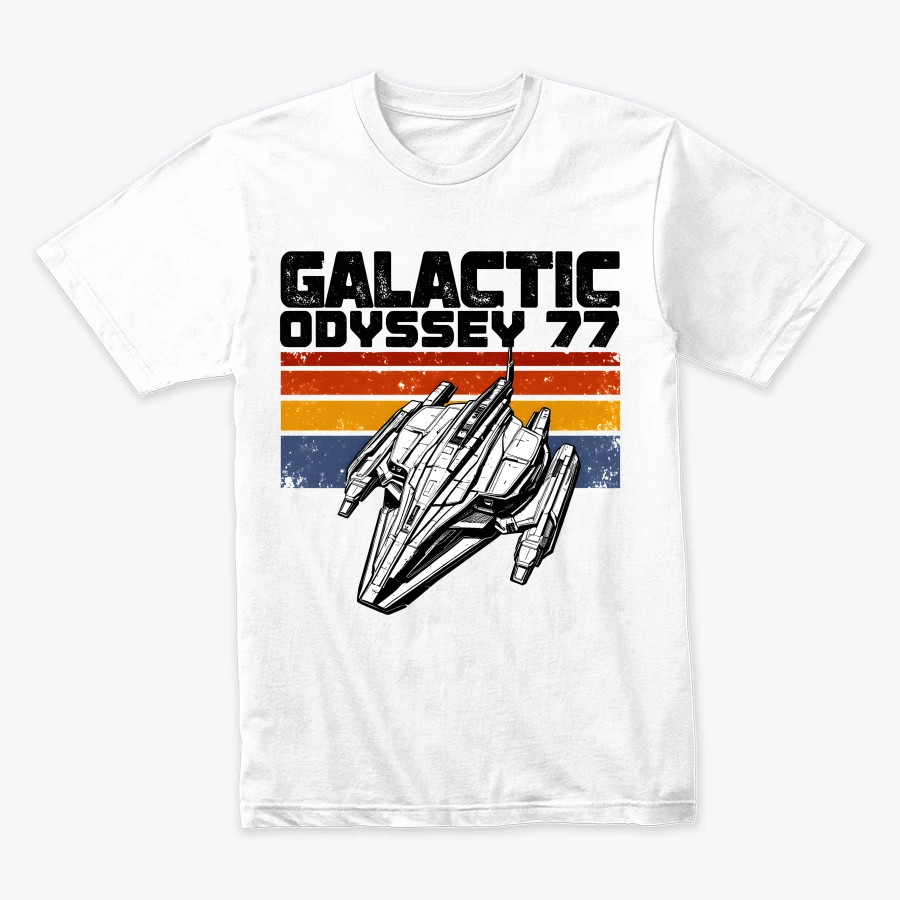 Blast back to 1977 with this Galactic Odyssey 77 design — a retro sci-fi spaceship graphic inspired by vintage space adventures and classic film nostalgia. Perfect for fans of intergalactic journeys, old-school sci-fi, and timeless starship aesthetics.