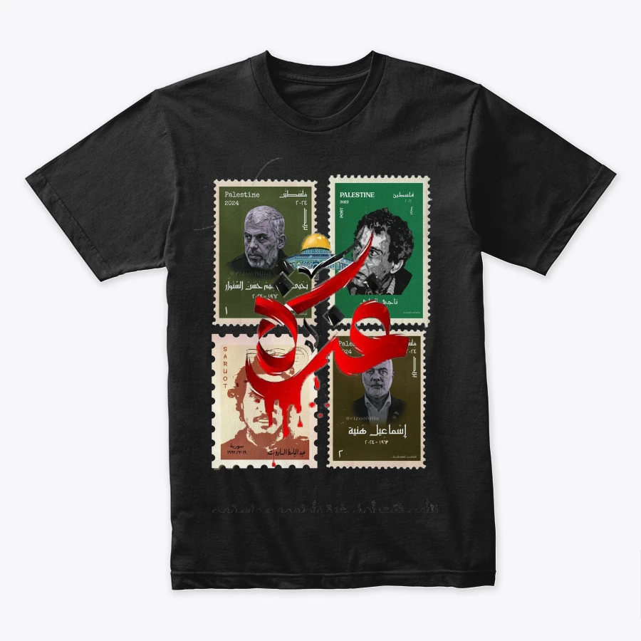 T-shirt unisexe بتصميم فني مستوحى من الطوابع البريدية القديمة، يجمع بين اللمسة التراثية والبعد الإنساني في لوحة فريدة من نوعها.