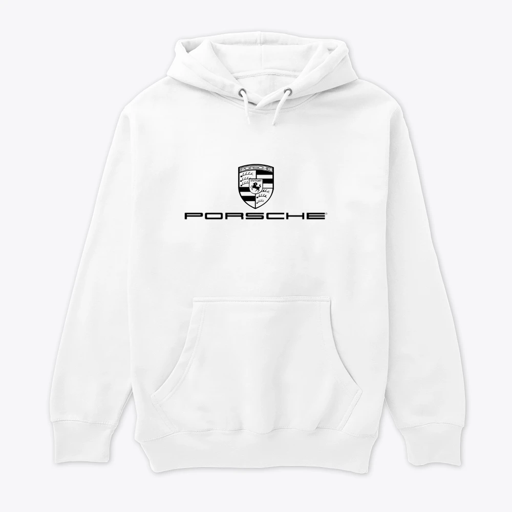 This describes two white hoodies with a Porsche theme: Front Logo Hoodie (Image 41b5c0/41bd63): A white pullover hoodie featuring the classic Porsche logo (crest and wordmark) printed in black on the chest. Back Graphic Hoodies (Image 41bd65/41b5bf): One has a humorous text graphic on the back: "NEED MONEY FOR PORSCHE URGENTLY" with an illustration of a black Porsche GT3 RS. The other features a technical/specifications graphic of the Porsche 911 GT3 RS with its blueprints, stats (Flat 6-Cylinder, 520 BHP, 0-62 MPH 3.2 Sec), and the German flag.