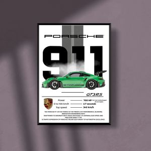 This is a modern, minimalist poster dedicated to the Porsche 911 GT3 RS. Key Visuals: Background: Light, possibly light blue or off-white, with bold black stripes running down the center. Car: A highly detailed illustration of the Porsche 911 GT3 RS in a distinctive Viper Green color, shown in side profile, with an effect of smoke or steam rising from the car. Text: "PORSCHE" is at the top. "911" is written in huge, dramatic black numbers behind the car. "GT3 RS" is prominently displayed below the car.