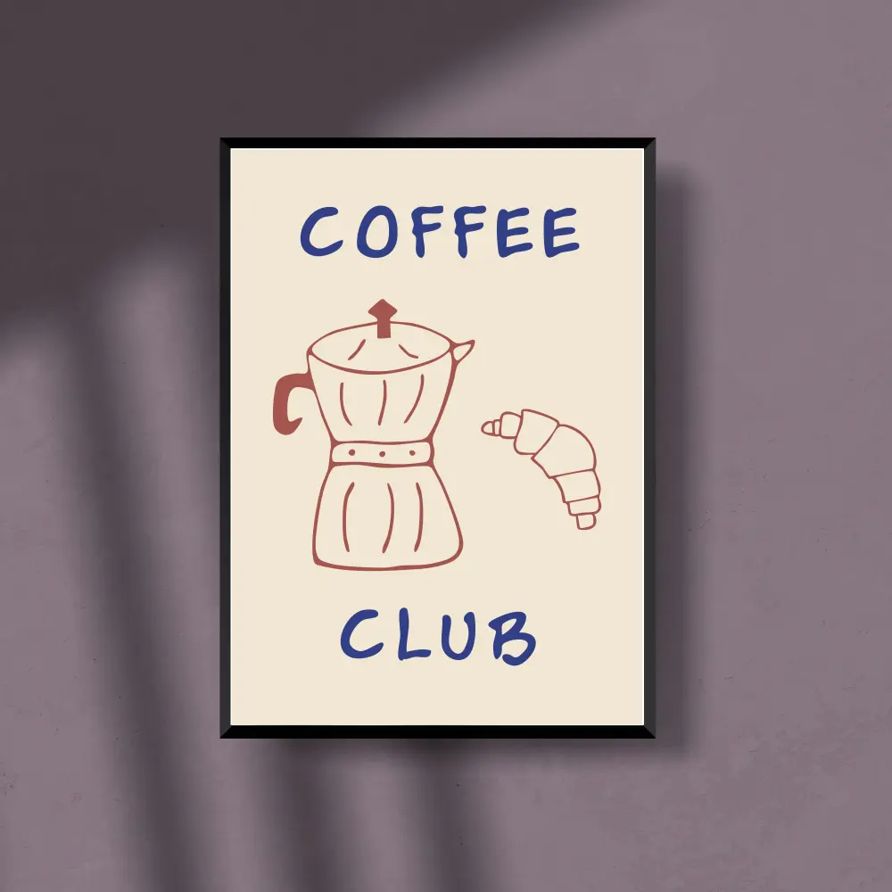 [Fr] Ajoutez une touche rétro à votre cuisine ou café avec cette affiche "Coffee Club" dessinée à la main. Parfaite pour les amoureux du café et les amateurs de moka pot.