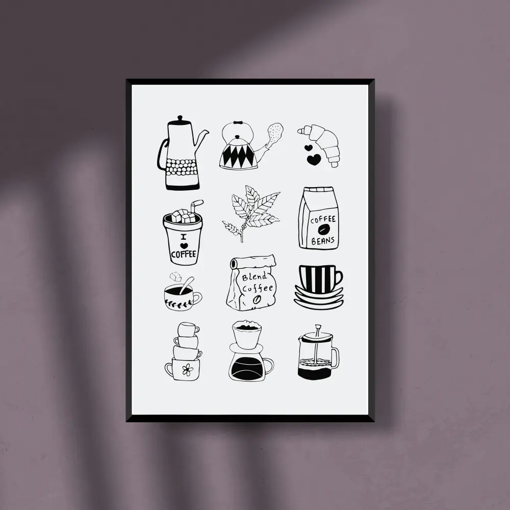 [Fr] Célébrez votre amour du café avec cette affiche moderne en noir et blanc. Elle illustre des cafetières, des grains et des tasses dans un style minimaliste parfait pour les coffee shops et les amateurs de design épuré. Besoin d’ajustements ? Vous voulez ce design sur un autre produit (t-shirt, mug, affiche, etc.) ? Contactez-moi à instagram: art_by_meryama et je le ferai avec plaisir ! [ENG] Celebrate your love for coffee with this modern black and white line art poster. Showcasing moka pots, beans, cups, and accessories, it’s perfect for baristas, coffee shops, and minimalist home décor. A must have art print for true coffee enthusiasts. Need adjustments? Want this design on another product (t-shirt, mug, poster, etc.)? Contact me at instagram: art_by_meryama and I’ll gladly make it for you!