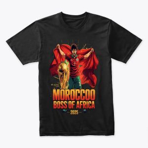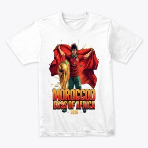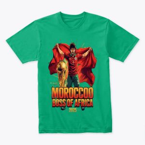 عمل فني بأسلوب الأنمي للاعب كرة قدم مغربي يقف بفخر حاملاً العلم المغربي، كأس أمم إفريقيا 2025 الذهبية تتلألأ بجانبه، نص بارز: «المغرب – زعيم إفريقيا»، ألوان حمراء وخضراء زاهية، إضاءة ديناميكية، أجواء ملحمية وانتصارية، تصميم مثالي لطباعة على قميص.