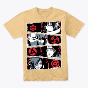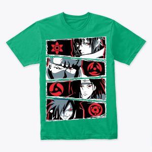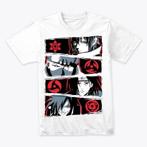 a dynamic animestyle collage showcasing characters with the sharingan featuring intense red eyes and iconic symbols set against a stark black background
