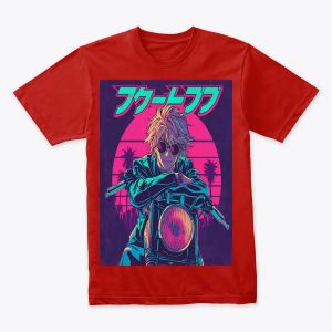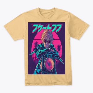 "شاب أنمي بمظهر كلاسيكي من التسعينات، شعر أشقر فوضوي ونظارات شمسية مستديرة، مستند إلى دراجة نارية قديمة، غروب شمس مع نخيل في الخلفية، ألوان وردية وبنفسجية زاهية، تأثير VHS، نص ياباني أعلى التصميم، أسلوب بوستر أنمي قديم مثالي للتيشيرت."
