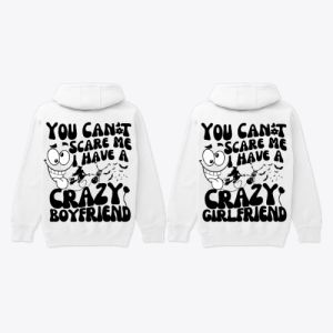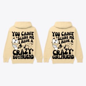 Introducing our bold and quirky couple's design: "You Can't Scare Me, I Have a Crazy Boyfriend/Girlfriend." This design is all about celebrating the unique dynamic between couples who pride themselves on their adventurous, spontaneous, and perhaps even a little wild relationship. With bold, eye-catching typography and vibrant colors, this design makes a statement. The phrase "You Can't Scare Me" boldly stands out, emphasizing fearlessness and confidence. The addition of "I Have a Crazy Boyfriend/Girlfriend" adds a playful twist, hinting at the fun and excitement that comes with being in a relationship with someone who keeps life interesting. Whether you're out for a stroll in the park, hitting the town for a night of fun, or just lounging at home together, this design is sure to turn heads and spark conversations. It's perfect for couples who love to embrace their unique bond and share their playful spirit with the world. Made with high-quality materials and available in a range of styles, including t-shirts, hoodies, and mugs, our "You Can't Scare Me, I Have a Crazy Boyfriend/Girlfriend" design is the perfect way to show off your love and adventurous spirit as a couple. Get ready to make a statement and showcase your fearless love with this fun and unforgettable design!