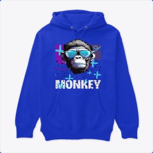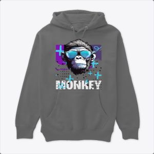 The design features a stylized illustration of a cool monkey wearing reflective sunglasses, with a confident and relaxed expression. The background includes abstract shapes and splashes of color, adding a fun and vibrant vibe to the design.
