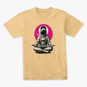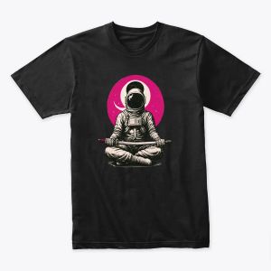 Un astronaute en position de méditation, tenant un katana avec calme et maîtrise. L’arrière-plan est dominé par un cercle rose vif évoquant une pleine lune stylisée, fusionnant l’esthétique japonaise traditionnelle avec une vision futuriste de l’exploration spatiale. Cette image symbolise l’équilibre entre technologie et sagesse intérieure, guerre et paix, modernité et spiritualité.