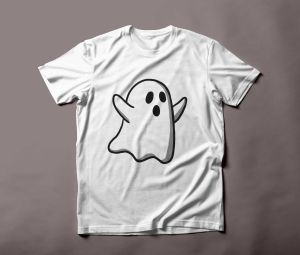 The t-shirt itself is made from premium, breathable cotton fabric, ensuring both comfort and quality. The ghost design takes center stage, positioned subtly off-center to give the shirt a trendy and asymmetrical aesthetic. The ghost's form is outlined in a faint, glow-in-the-dark ink, adding an extra layer of fun to the design.