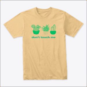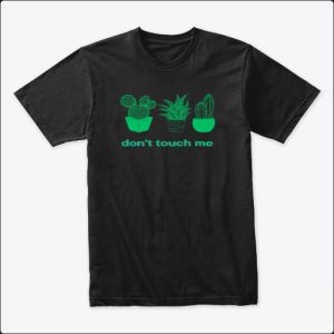 This design features three different potted cacti and succulents, each drawn with simple, clean lines in a green color. The phrase "don't touch me" is humorously placed below the plants, playing on the idea that cacti are known for their prickly and untouchable nature. The message is bold and playful, using a neon-like font that gives the design a modern, edgy feel.