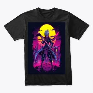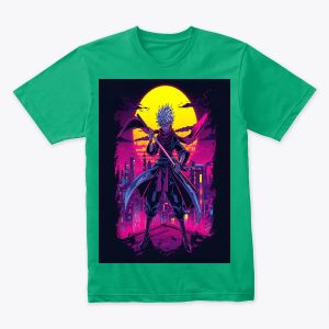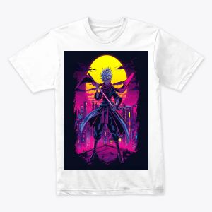 شخصية أنمي ديناميكية ذات شعر فضي شائك، ترتدي زي ساموراي مستقبلي، تمسك بسيف كاتانا متوهج، واقفة على سطح مضاء بأضواء النيون تحت ضوء قمر مكتمل