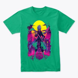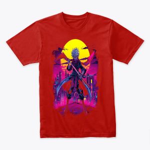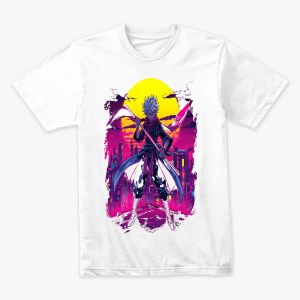 dynamic anime character with spiky silver hair, wearing a futuristic samurai outfit, holding a glowing katana, standing on a neon-lit rooftop under a full moon