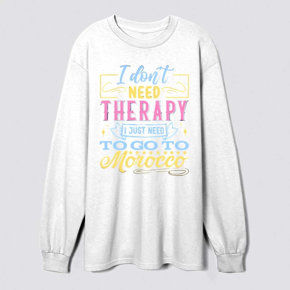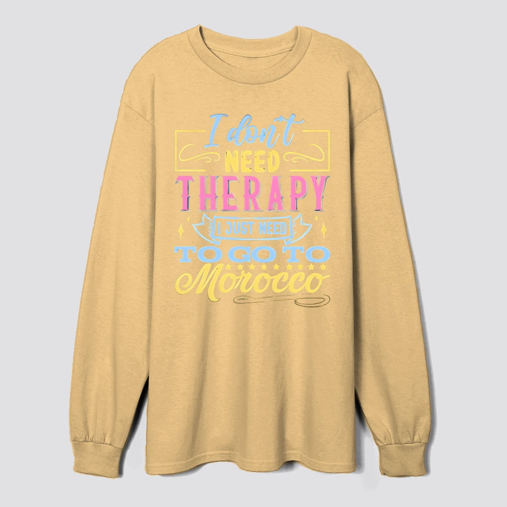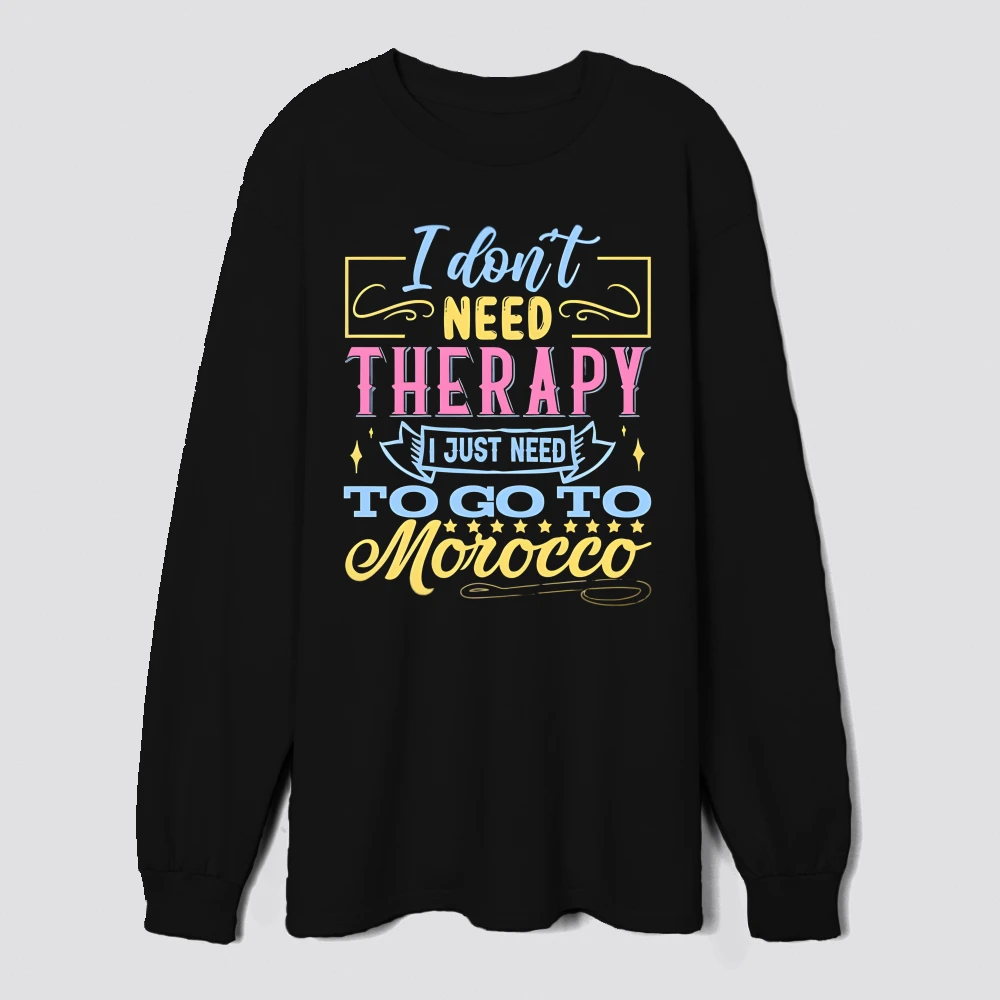 description a colorful typographic design featuring the quote i dont need therapy i just need to go to morocco highlighting travel as a form of personal escape and adventure