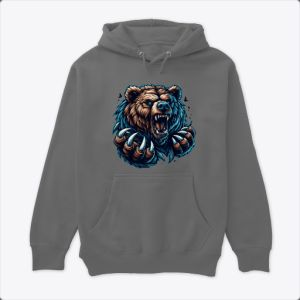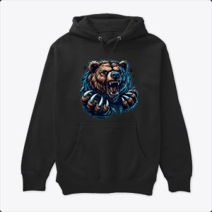 The design portrays a powerful and aggressive bear, its mouth wide open in a roar, showcasing sharp teeth and claws. The bear’s fur is detailed with a mix of rich browns and cool blues, adding depth and a striking contrast. The intense expression and razor-like claws give the design a fierce, primal energy. This artwork evokes strength and dominance, making it a bold and dynamic statement piece perfect for showcasing an untamed and wild spirit.