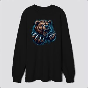 The design portrays a powerful and aggressive bear, its mouth wide open in a roar, showcasing sharp teeth and claws. The bear’s fur is detailed with a mix of rich browns and cool blues, adding depth and a striking contrast. The intense expression and razor-like claws give the design a fierce, primal energy. This artwork evokes strength and dominance, making it a bold and dynamic statement piece perfect for showcasing an untamed and wild spirit.