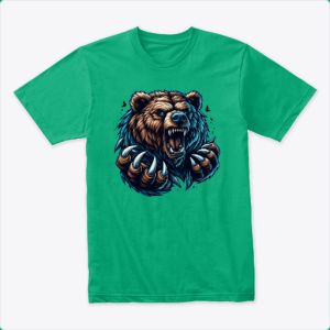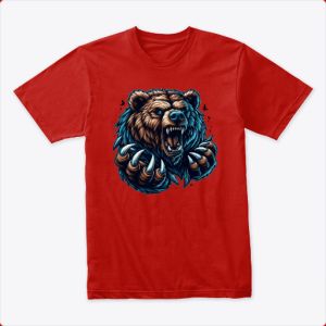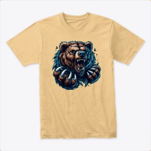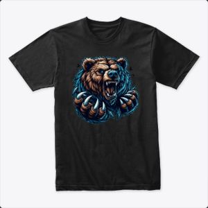 The design portrays a powerful and aggressive bear, its mouth wide open in a roar, showcasing sharp teeth and claws. The bear’s fur is detailed with a mix of rich browns and cool blues, adding depth and a striking contrast. The intense expression and razor-like claws give the design a fierce, primal energy. This artwork evokes strength and dominance, making it a bold and dynamic statement piece perfect for showcasing an untamed and wild spirit.