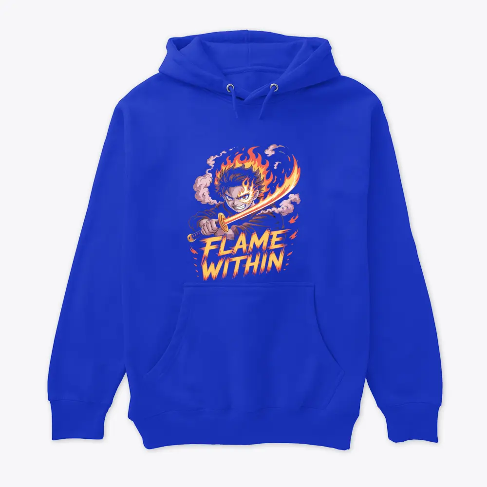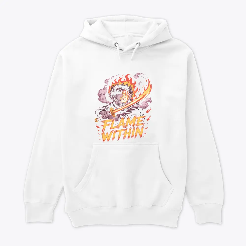 an anime character with fiery hair wields a flaming sword exuding intense determination the bold design features vivid flames and dynamic text reading flame within