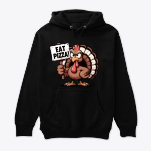 The T-shirt features a vibrant and festive design centered around a comical turkey character, likely with a jovial expression. The turkey might be wearing a pilgrim hat, adding a playful twist to the traditional Thanksgiving imagery. It could be standing amidst a colorful autumnal background, with falling leaves and perhaps a cornucopia overflowing with seasonal fruits and vegetables nearby.