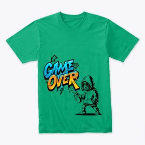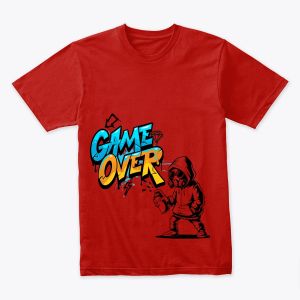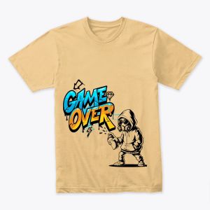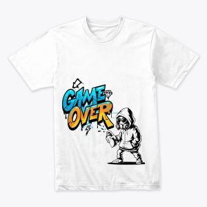 T-shirt stylé au design « Game Over » inspiré du street art, avec un mélange de couleurs vives et un personnage en hoodie portant un masque à gaz en plein graffiti. Un look urbain, audacieux et moderne, idéal pour les fans de gaming, de culture urbaine et de graphisme artistique.