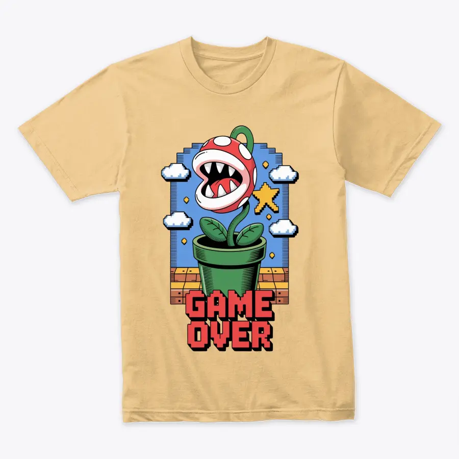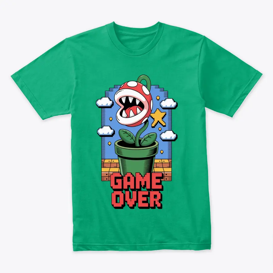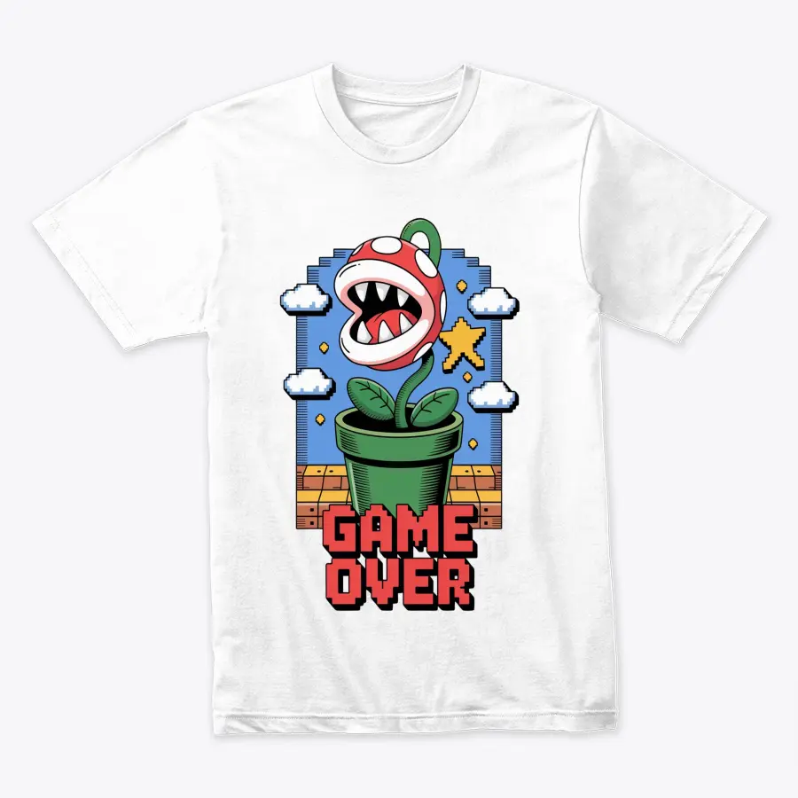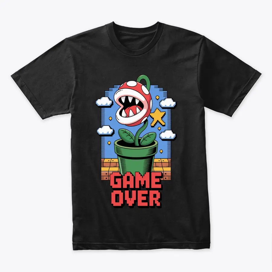 description a retro video gamethemed image featuring a pixelated piranha plant in a pot surrounded by clouds and a star with the bold red text game over at the bottom